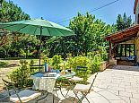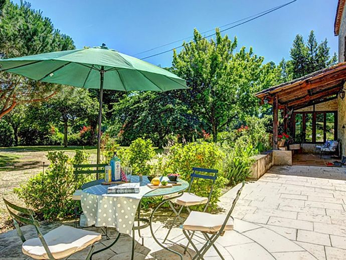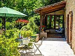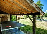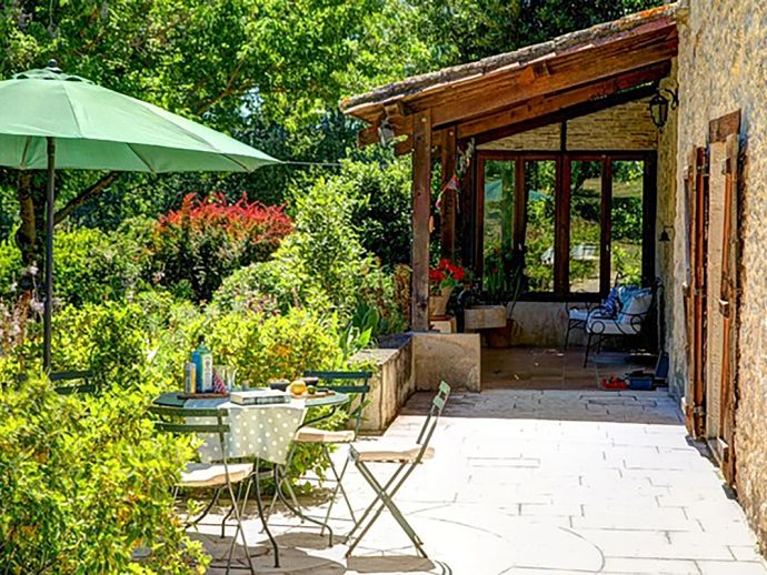 Another terrace, which runs along one side of the house, is framed with a wonderful mix of plants and partially covered for respite from the summer sun. From here, the pool can be glimpsed set in its elevated position in the garden whilst close by one of the stone barns in the garden provides a shady spot for table tennis.