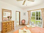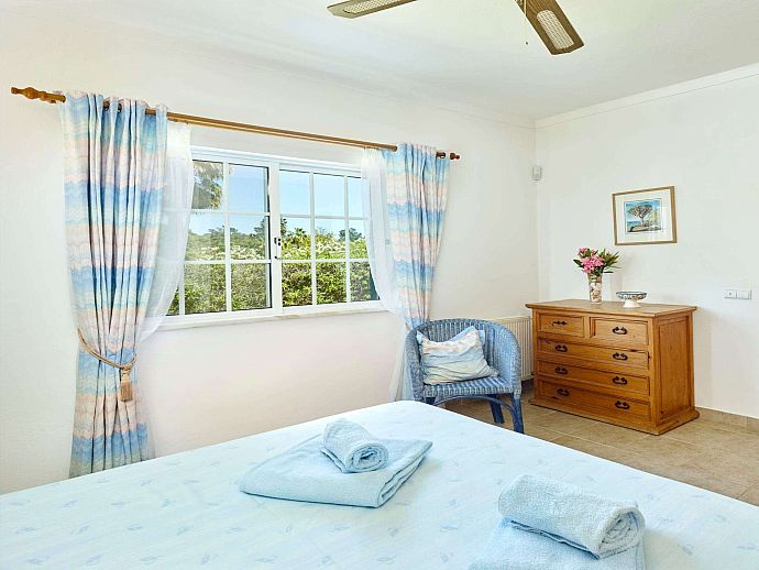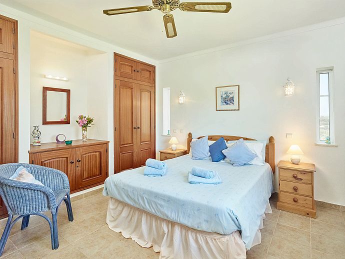 Bedroom: 1 double bed, A/C, ceiling fan, en-suite bathroom (bath/shower w/c), patio doors to terrace.