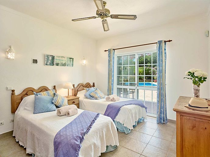 Bedroom: 2 single beds, A/C, ceiling fan, en-suite bathroom (shower, w/c), patio doors to terrace