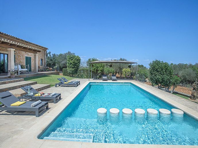 Private swimming pool (10m x 5m) with corner Roman steps and designated shallow section.