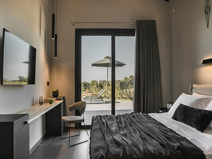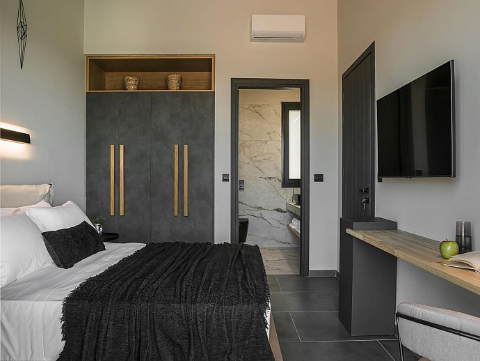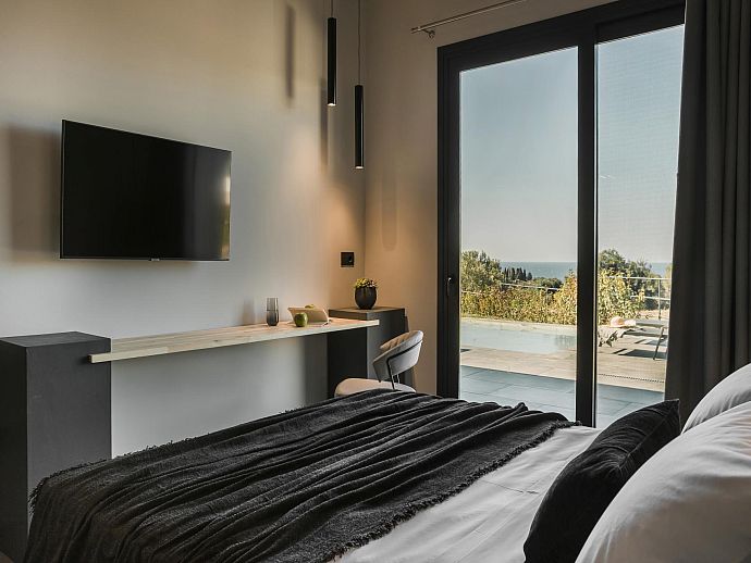 Bedroom: 1 double bed, A/C, TV, en-suite shower room, doors to pool terrace.