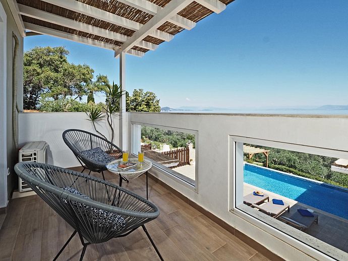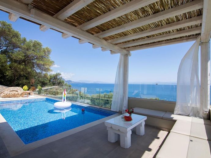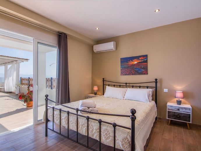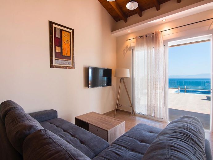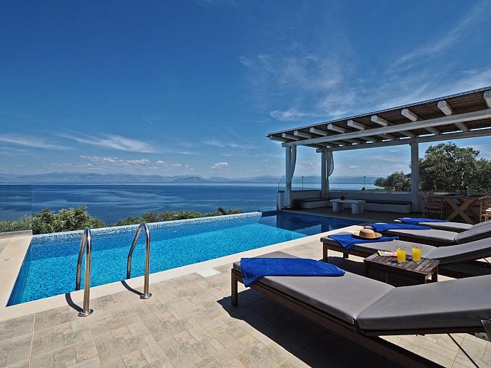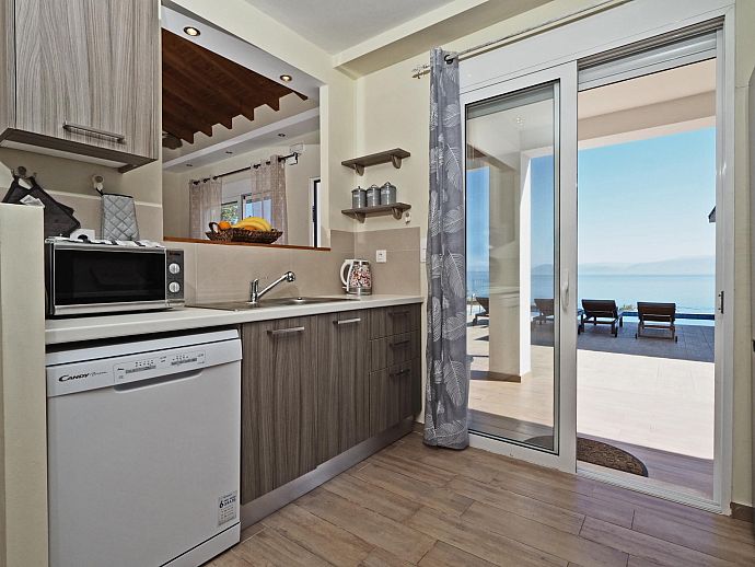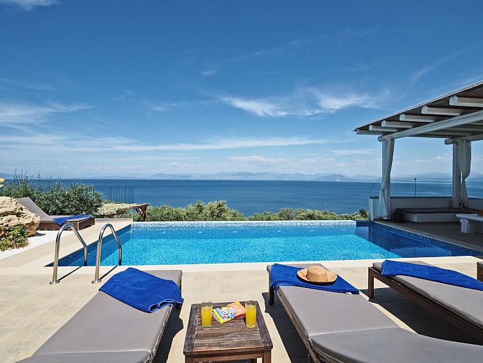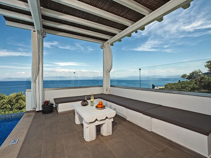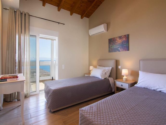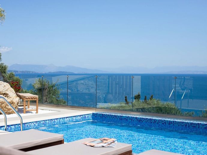 Cosily informal, the unfussy interior has a décor of soft pastel shades, colourful wall prints and Amtico-style flooring. Numerous sliding doors allow an abundance of light to flood in, not only ensuring rooms always feel bright, fresh and very welcoming but also offering a perfect vantage point from which to witness the gorgeous Corfu sunrises (and without even having to leave bed if you so choose!).