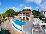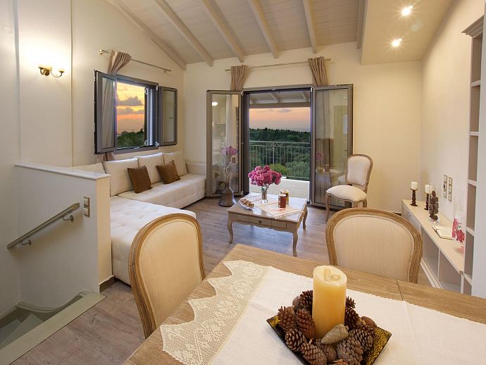 Beautiful sweeping views across hectares of olive and cypress treetops to the sparkling Ionian Sea complement this elegant home, situated close to the emblematic port of Fiscardo (4km) and its adjacent beach Emblisi (3.5km) as well as the lovely little beach of Alaties (5km) where the friendly waterside taverna is renowned not just for tasty food but as a sought-after spot for sunset cocktails.
