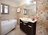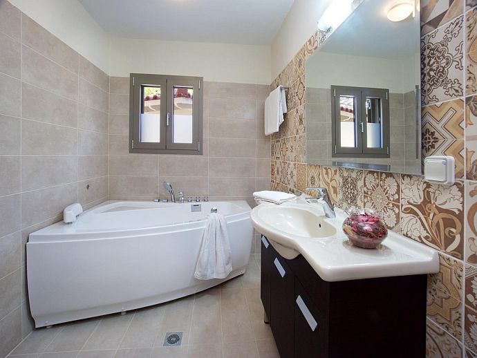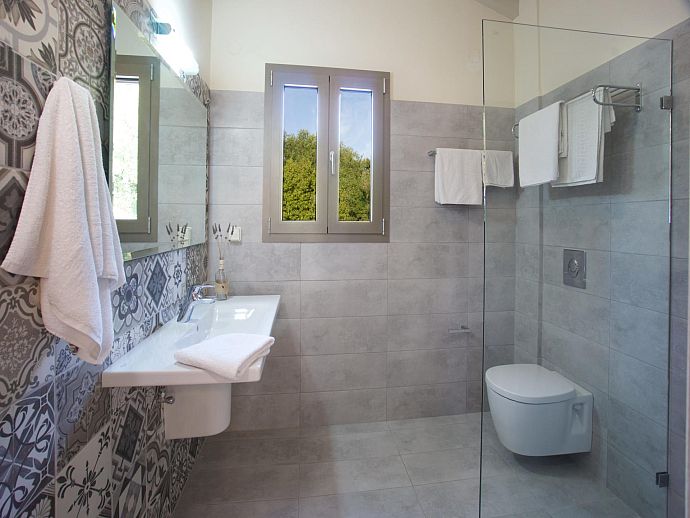 Lower Floor: Inner hallway (washing machine). Double bedroom (A/C) with en suite bathroom and doors to pool terrace. Double bedroom (A/C) with en suite bathroom (corner bath) and doors to pool terrace.