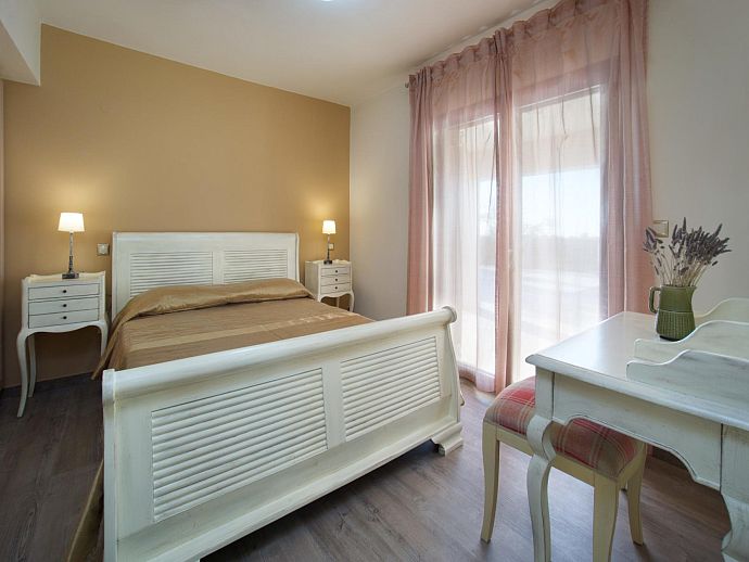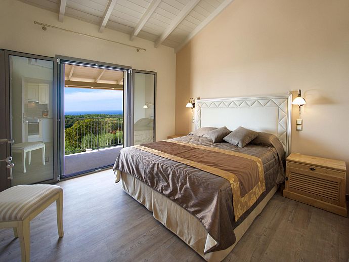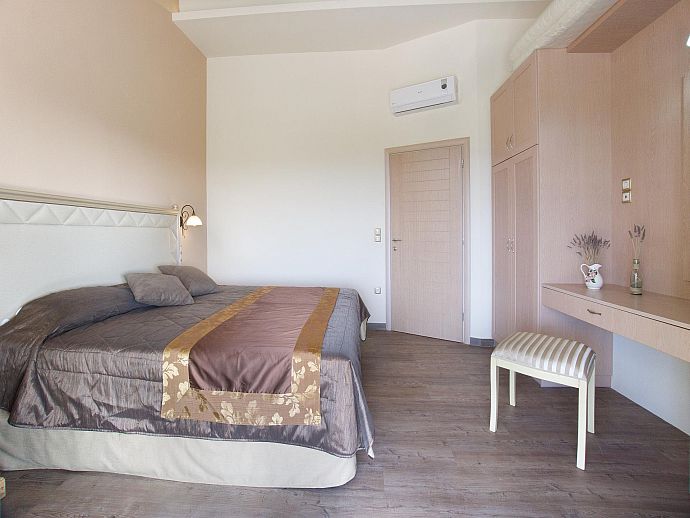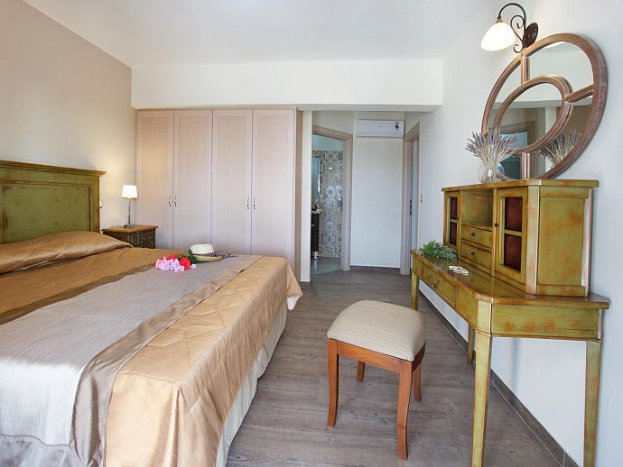 Bedroom: 1 double bed, A/C, en-suite bathroom, doors to pool terrace.