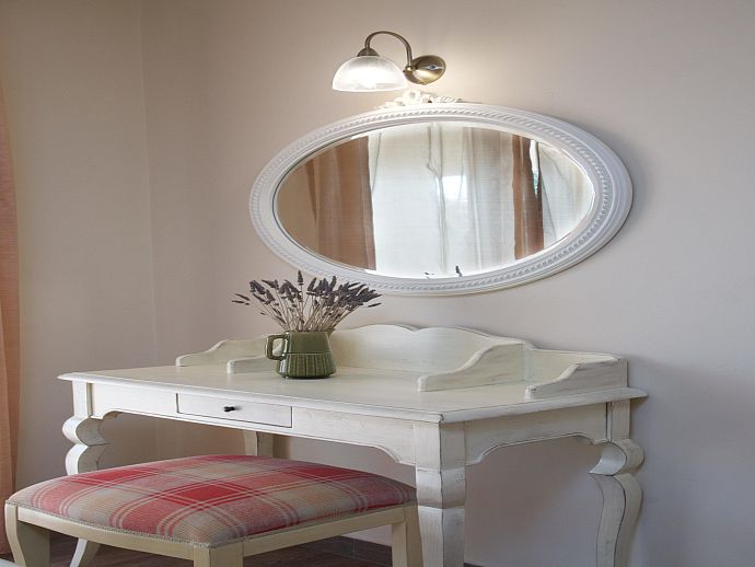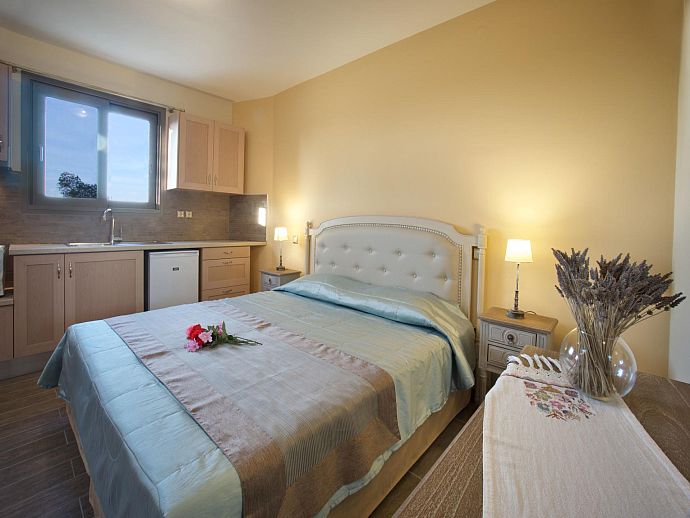 Self-Contained Studio: Private exterior entrance from lower pool area, A/C, Sat TV, double bed, kitchenette (combi oven, small hob, fridge, sink), en suite shower room.