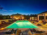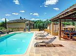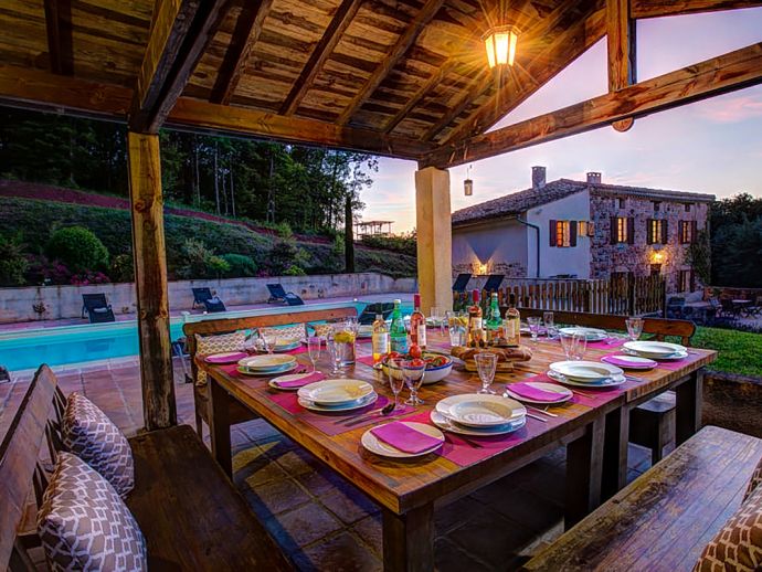 Private swimming pool (10m x 5m) with Roman steps, surrounded by large terrace with covered dining area.
