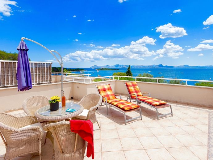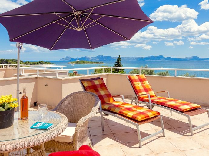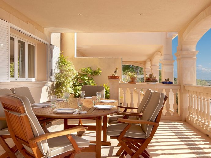 Villa Alcanada Beach has an excellent location next to the beach and Club de Golf Alcanada in the bay of Aucanada. A small and quiet area on the northern edge of the well-known Alcúdia bay on the north coast of Mallorca and just a few minutes drive from the town of Port d'Alcudia. Opposite the island Illa de Alcanada with its lighthouse that features on many postcards you will find the small, romantic stone beach Playa de Alcanada. The beach is lined with shady pine trees and the water is clear-turquoise, calm and at 1.5 m deep, you can swim or walk to the island with a fine sandy beach. For a wider choice, the shops, restaurants and atmospheric old streets of Alcudia are 10 minutes drive and a real treasure on the island. A perfectly restored medieval walled city on the site of a Roman settlement with the remains of ancient houses and a theatre, with a wealth of history and charm this town offers visitors an authentic Mallorcan experience. The weekly market in the old town is considered one of the most important on the island with a wide variety of products on offer. There are plenty of cafes and Alcudia is also well-known for its' restaurants specialising in traditional Mallorcan food.