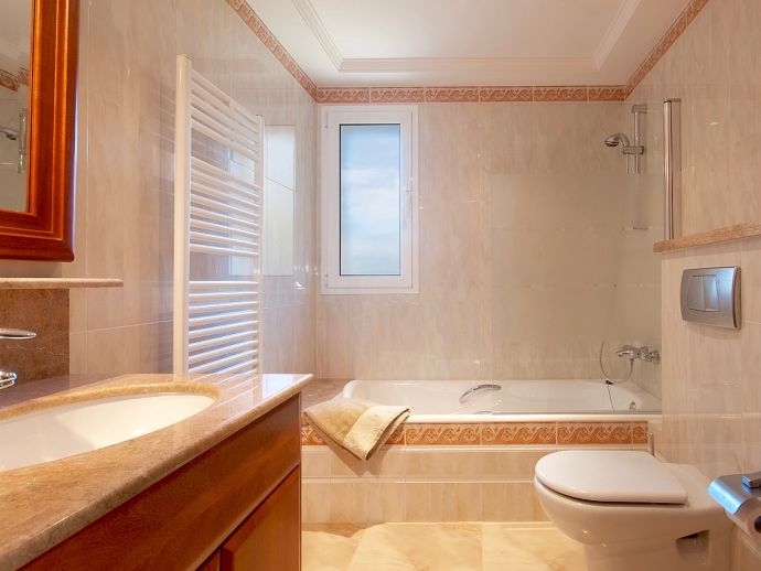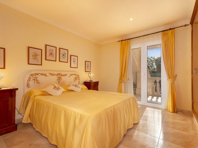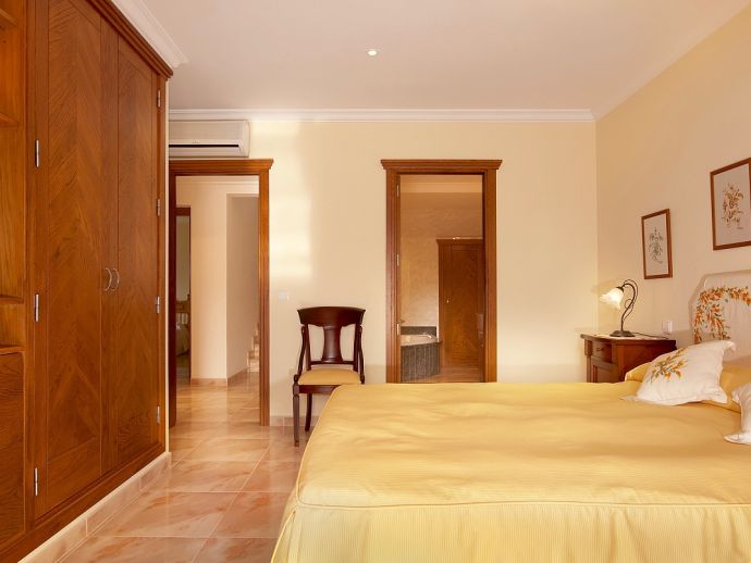 Master Bedroom: 1 double bed, A/C, en-suite bathroom (bath/shower over, w/c), access to terrace/pool area