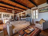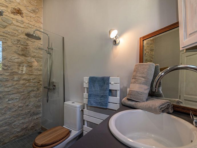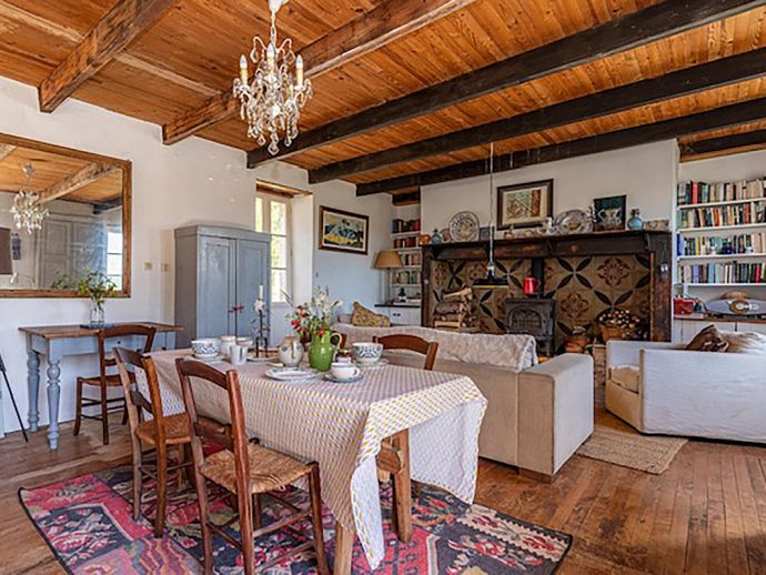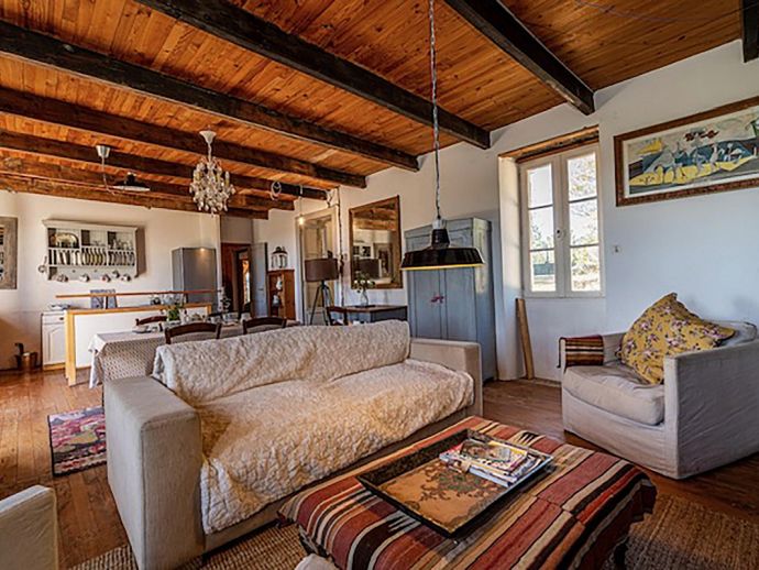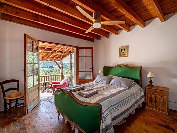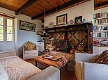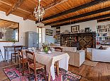 The charm of this rustic haven continues indoors. Wood beams and floors, a deep fireplace lined with patterned tiles, a glass chandelier and cosy sofa and armchairs give character and style to the open plan area, zoned into three distinctive areas (kitchen, dining, living). Both bedrooms have access to the covered terrace and the recent addition of a shower room means there is a bathroom for each bedroom.