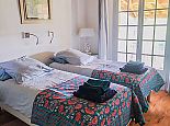 Bedroom: 2 single beds, ceiling fan, French doors to covered terrace