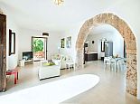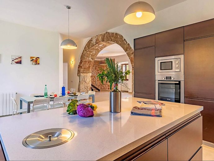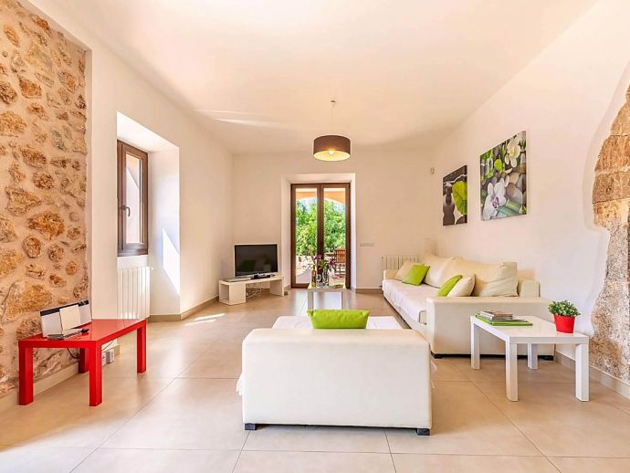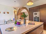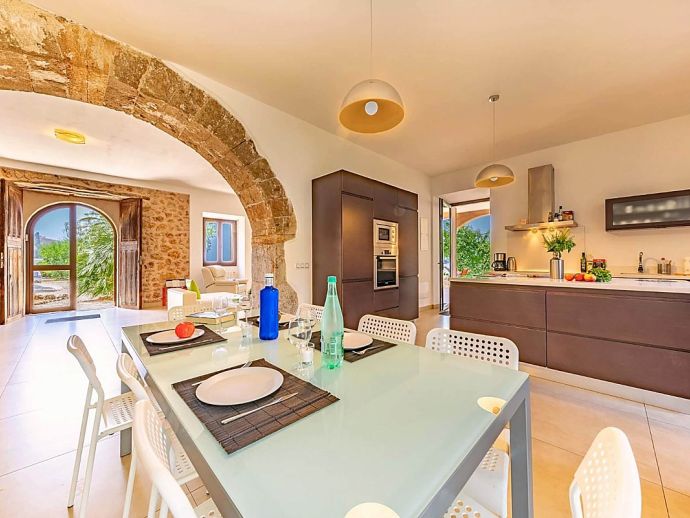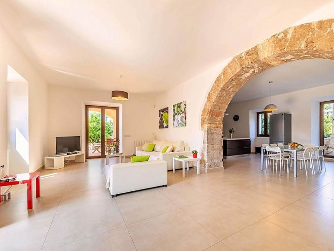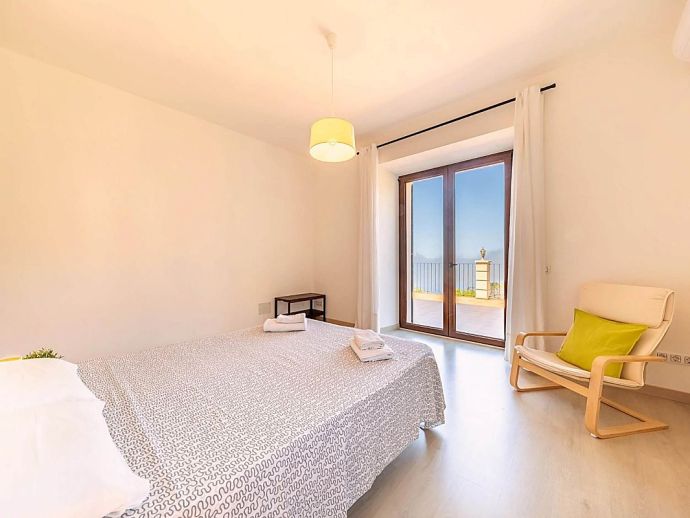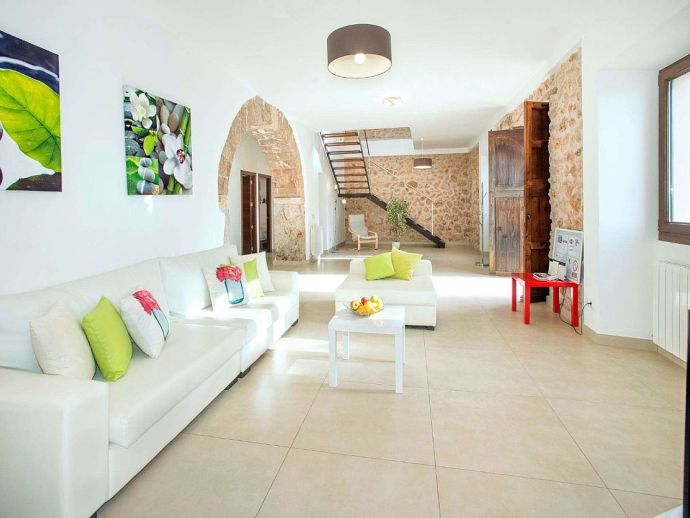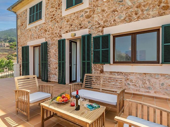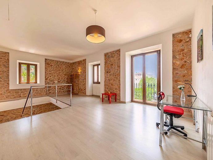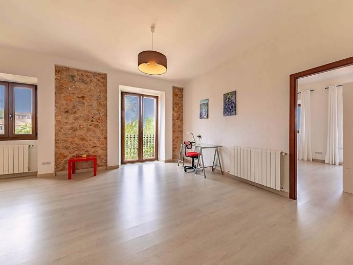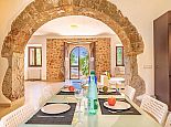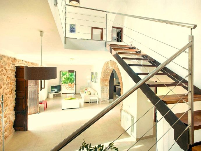 Positioned on the fringes of the modest village of Banyalbufar this antiquated, rustic farmhouse has recently undergone a complete renovation, transforming it into comfortable yet very stylish accommodation. Ornate Juliet Balconies with green painted shutters, stone clad wall features and natural stone arches blend seamlessly with contemporary furnishings and a modern, fully equipped kitchen. In keeping with the interior design, open tread stairs lead to an upper level with capacious bedrooms and an ample, sea view terrace.