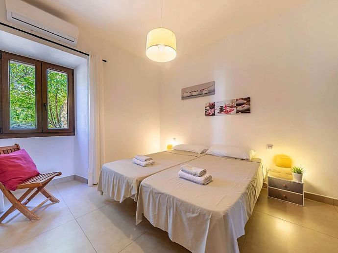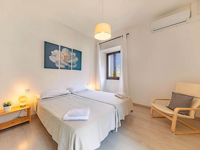 Bedroom: 2 single beds, A/C, doors to shared terrace, sea views
