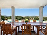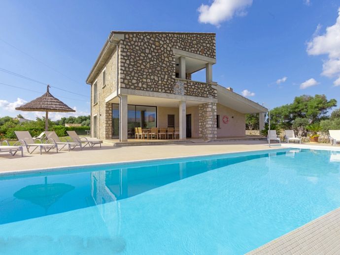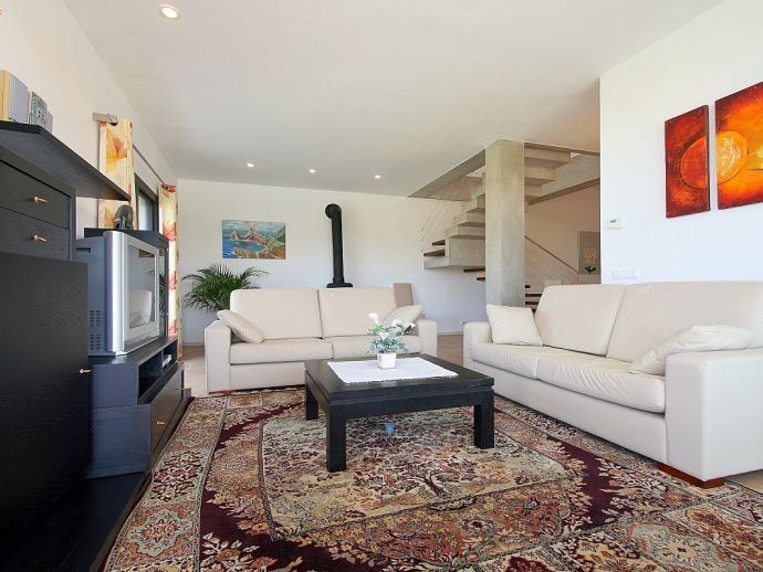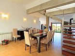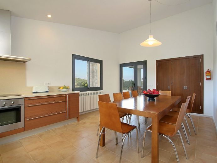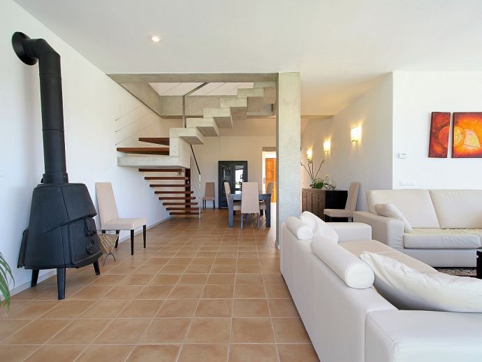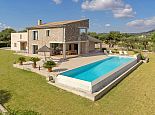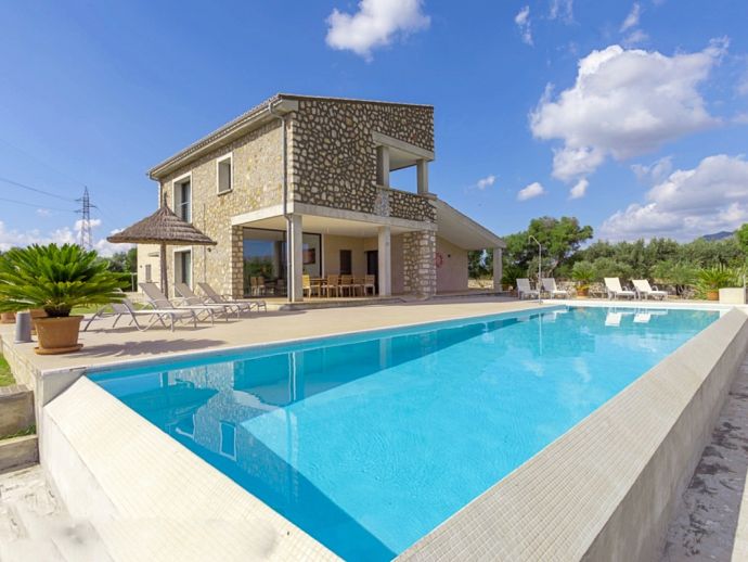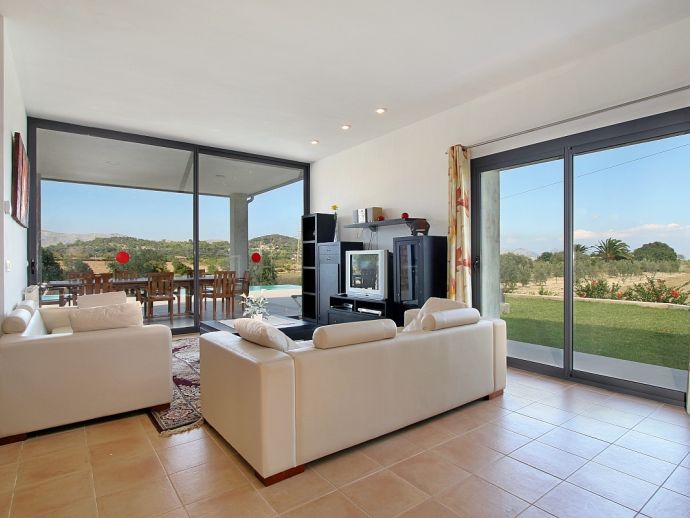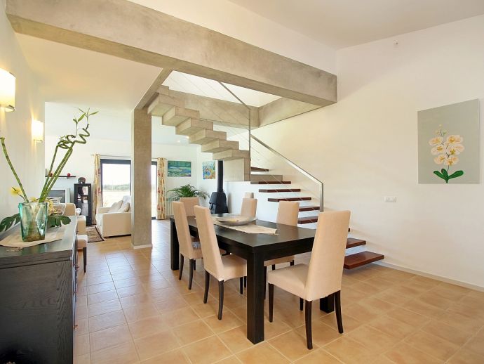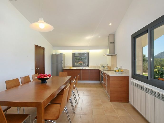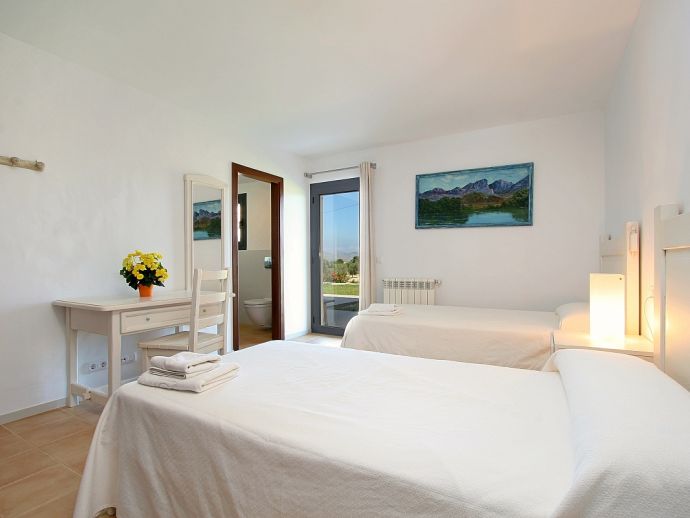 Villa Font is a modern and stylish 5 bedroom holiday home with a private swimming pool and an idyllic countryside setting, whilst being perfectly located just a short drive from old town Pollensa and conveniently close to the sandy beaches of Port de Pollenca and Cala San Vicente. The property sleeps 10 guests and offers extensive outdoor areas, a stunning contemporary design and panoramic views over the Tramuntana mountains to the bay of Pollensa and beyond. Distributed over two floors, the ground floor comprises an enormous and airy lounge/dining area complete with comfortable sofas, modern furniture and a large dining table seating 10. Glass patio doors not only provide access to the garden and covered terrace, but also offer stunning views of the surrounding area and the pool. Off the dining area, there is a long corridor leading to the bedrooms and bathrooms. 3 of the bedrooms are located on the ground floor: there is a double bedroom with an en-suite full bathroom, a twin bedroom with an en-suite shower room, a further twin bedroom and a shower room. All of these rooms have doors leading out to a covered terrace with lovely country views. Stairs lead up to the first floor (with horizontal balustrades on the staircase - care should be taken with children), housing a twin bedroom, a double bedroom, featuring a floor to ceiling window with incredible views. From the outside dining terrace, steps lead to the lawned area with a built-in barbecue alongside, the large private pool is surrounded by lawned gardens and by sunbathing terraces, perfect for lazy days under the Mallorcan sun. This impressive villa provides a peaceful retreat for families/friends who enjoy outdoor living and a convenient location close to amenities, stunning beaches, and ancient towns!