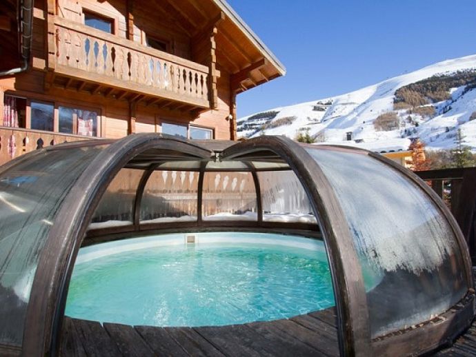 Traditional Wooden Chalet with Private Heated Pool, Sauna & Lovely Mountain Views in the Heart of Les Deux Alpes!