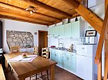 Attractive beamed ceilings and walls of part-exposed stone add character to the comfortable interior. Stairs from the kitchen lead up to the first floor double bedroom with en suite shower room, whilst the mezzanine area above the living room is accessed by ladder style stairs.