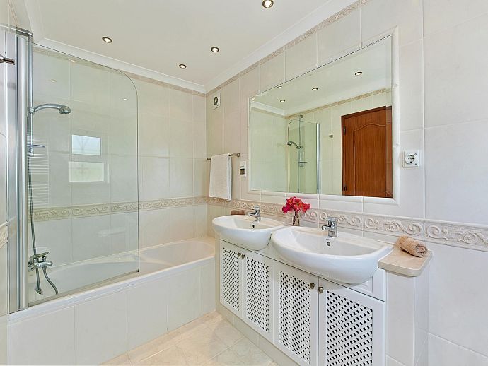 Ground Floor: Living/dining room (AC, Sat TV, DVD, WiFi, fireplace), with doors to covered terrace and garden. Kitchen (oven, microwave, dishwasher). Utility room (washing machine). Twin bedroom with en suite shower room and doors to terrace. Double bedroom (AC) (continental bed) with ensuite bathroom, (separate shower) and doors to terrace. Central heating available payable locally*.