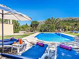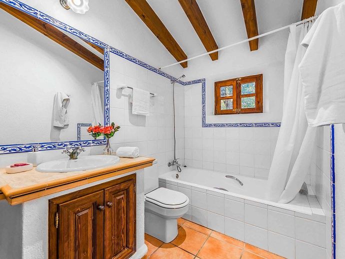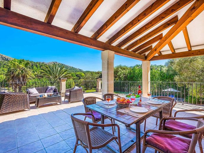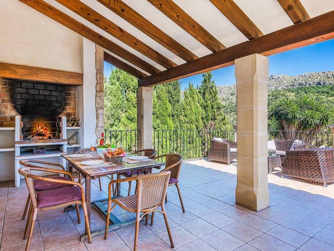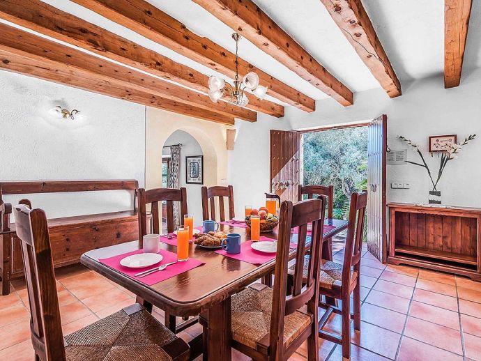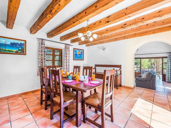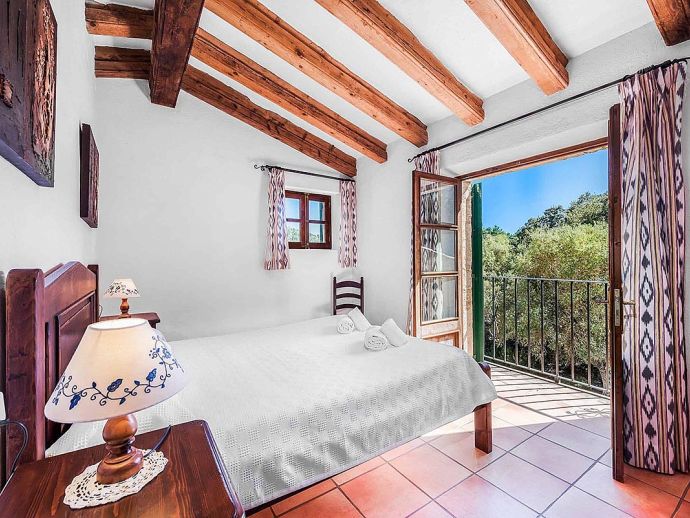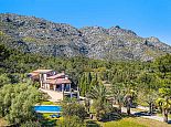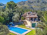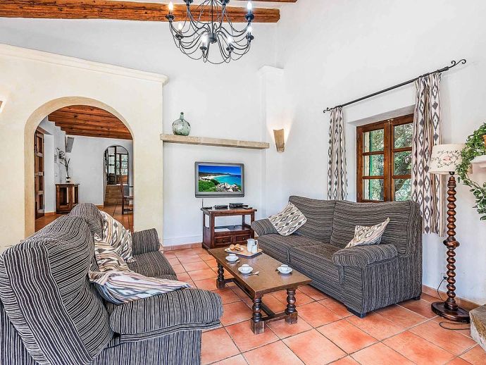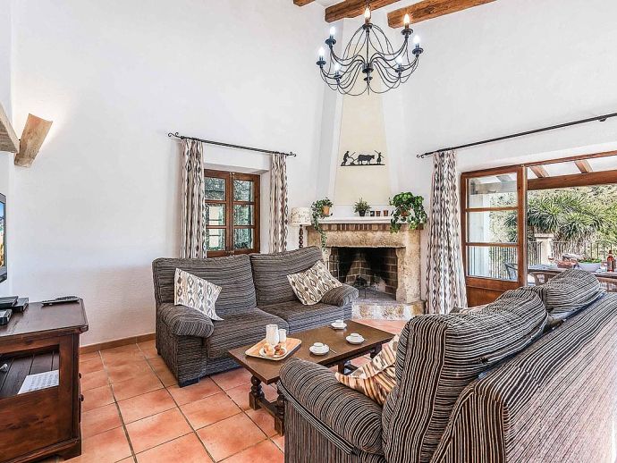 Villa Leandro with a private pool and extensive gardens is a stunning classical Mallorcan Villa with an enviable location. Set in the foothills of the Tramuntana region offering beautiful all-round views whilst being just a 5-minute drive to Cala San Vicente with a splendid beach, three small bays and crystal clear waters. The house sleeps up to 6 guests in bright and airy interiors that are traditional in style with beamed ceilings, tiled floors and whitewashed walls whilst having modern amenities included. It comprises a living room with a feature fireplace, comfortable sofas, a flat screen TV with entertainment systems, satellite channels, DVD player, Wi-Fi and two sets of French doors opening out to the terrace. The dining room is a few steps up, through an archway and furnished with a wooden table/chairs, this room leads to a fully fitted and equipped kitchen and a utility room. There are 3 air conditioned bedrooms, 2 twins on the ground floor that have doors to the terrace and share a family bathroom positioned between them. The master bedroom is upstairs, a double room with fitted wardrobes, en-suite bathroom and doors out to a balcony. The property offers extensive, private gardens with palm trees, lush greenery, flowering bushes and a large lawn area surrounding an inviting private pool with crystal clear waters and Roman steps. The views from the main terrace are truly breath-taking, it has been partially covered with a built in-barbecue and a shaded alfresco dining area. Villa Leandro provides a very private and idyllic holiday retreat in a picturesque and unspoiled area of Mallorca whilst still being close to fabulous beaches and restaurants!