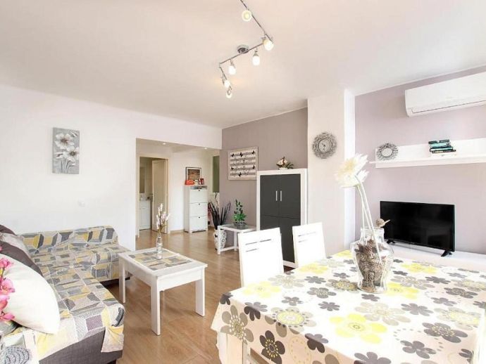 Apartment Rocio is a second floor apartment with a large sunny balcony situated right in the heart of Port de Pollenca, just 5 minutes walk from the beach, the pine walk and the main square. The interiors are modern in design with air conditioning, wooden floors and white walls providing bright and clean accommodation for up to 5 guests. There is a spacious lounge and dining area with glass doors to the balcony and a separate fully equipped kitchen (electric oven, ceramic cooktop, fridge/freezer, microwave, dishwasher, etc.) with a breakfast table and plenty of storage space. The bedrooms comprise of 2 light and airy twin rooms with glass patio doors out to the balcony and a further room with a single pull-out bed that all share 2 bathrooms. The large balcony is furnished with a table and chairs, great for al fresco dining or just watching the world pass by. Rocio provides an excellent base for a beach holiday and also being centrally located there are numerous bars, restaurants and shops right on the doorstep making it ideal for those who enjoy being in the heart of a resort with all its amenities and nightlife.