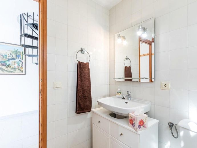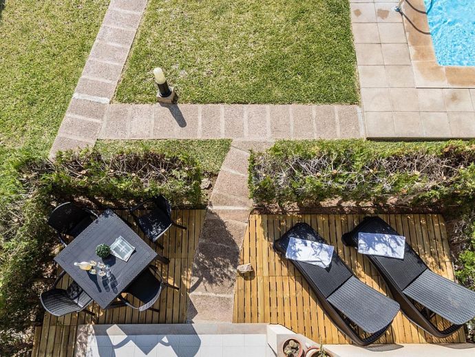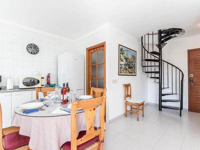 Apartment Limonera is a cosy duplex apartment for up to 4 guests set on a small complex with a private decked terrace and direct access to the communal pool and garden. Located in the quiet residential area of Llenaire, on the outskirts of Port de Pollenca, the apartment is less than a five minute walk to the long stretch of sandy beach and crystal clear waters of Pollenca Bay. Inside, is set over two floors with a spiral staircase leading up to the 2 air conditioned bedrooms and a full bathroom. There is also a balcony on this level overlooking the pool and garden. The ground floor comprises a handy cloakroom (w/c) and an open plan living space with a lounge, dining area and a well-equipped kitchen. Glass doors allow plenty of natural light and open out to a private area furnished with 2 sun loungers and a dining table enclosed with a small hedgerow. In addition to the beautiful sandy beach, there are shops and restaurants nearby and a 20 minute stroll along the promenade will take you to the main town of Port de Pollenca. Limonera is a great choice for a small family or a couple seeking a relaxing, sun-filled holiday close to the beach and Port de Pollenca!