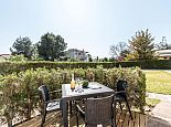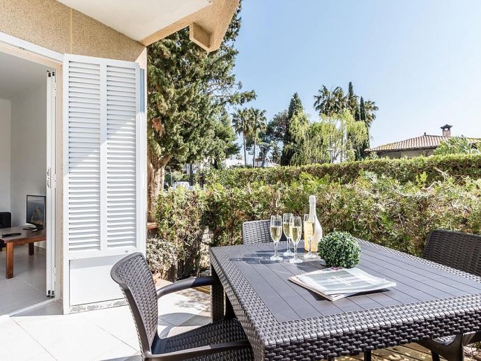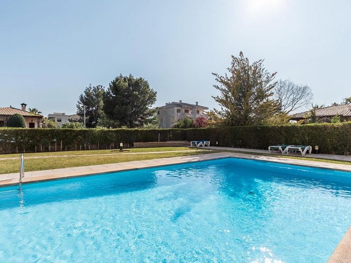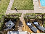 • Private to the Apartment: Small hedged garden with access to the pool, decked and furnished with 2 sun loungers and a dining table. Upper floor balcony overlooking the communal pool and garden.