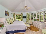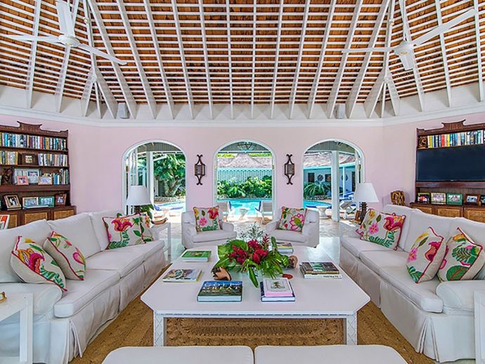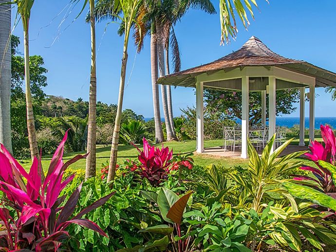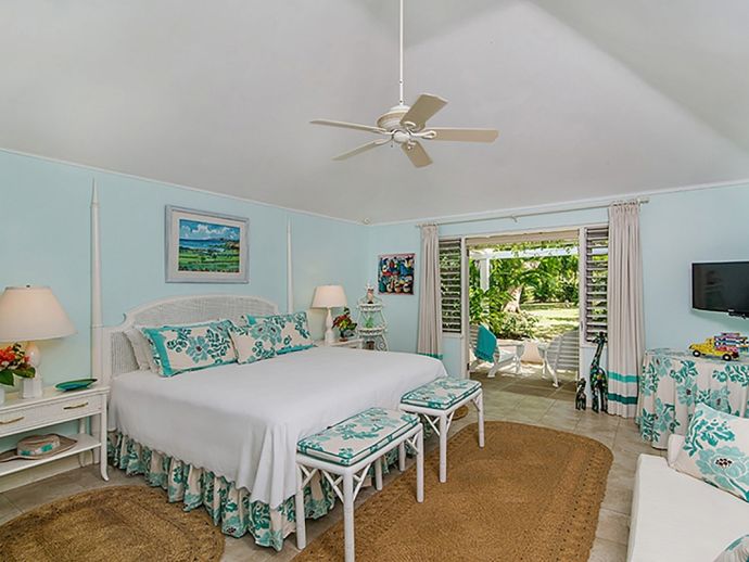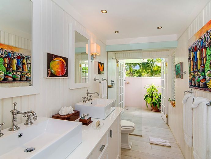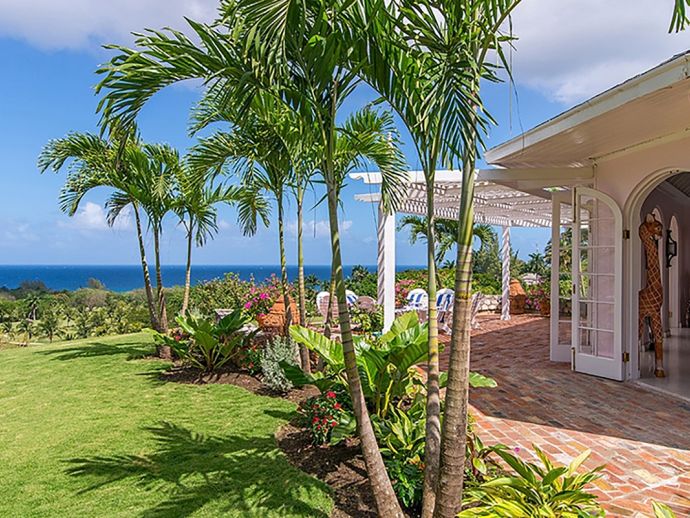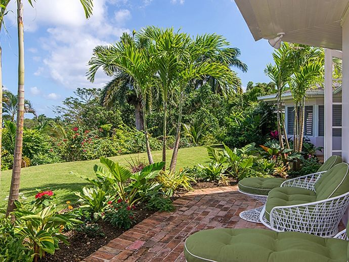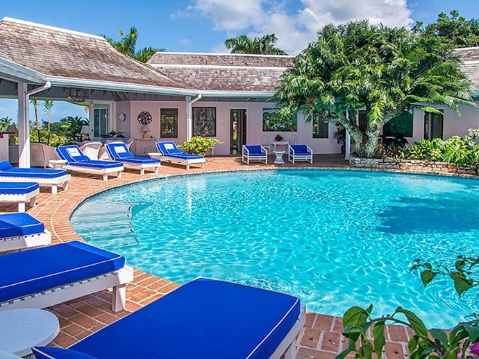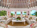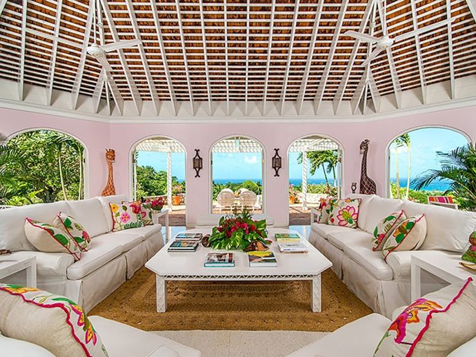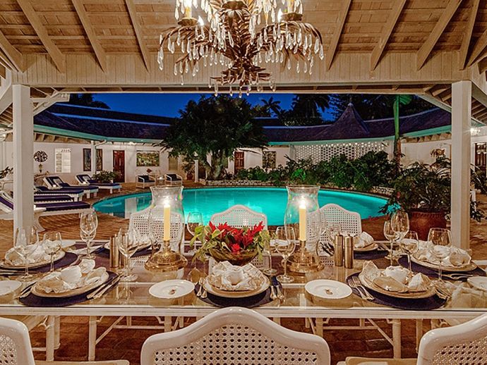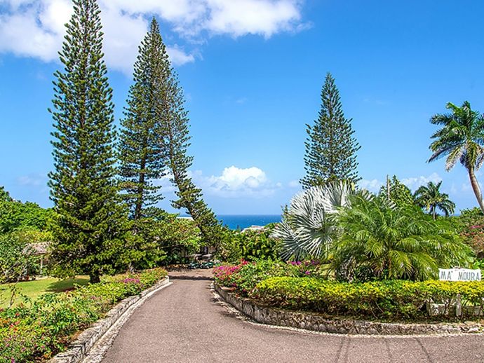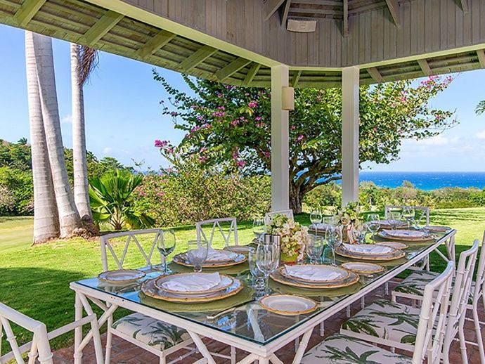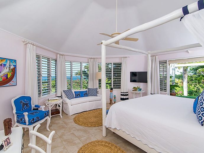 Ma Moura is a romantic, exceptionally charming villa perched high on a hill with gorgeous sea views, lovingly tended gardens and an interior that is blessed with a wonderful collection of art and some amusing wood-crafted sculptures. The villa has four bedrooms with a wonderful circular and octagonal design that embraces spectacular views of the Caribbean sea from all angles. A fluid, transparent light glows in the living room and captures seductive vistas of gardens, golf course, and the sea below. With its comfortable Caribbean style, the living room is a perfect haven for family and friends to gather. There is a backgammon table, bridge table, flat-screen TVs, and DVD player. With wide sliding doors all around, the living room opens to the pool and to a newly added terrace outdoors, a perfect setting for evening cocktails or dinner under the pergola. Surrounding the circular swimming pool are the bedrooms, dining area, sitting area, kitchen, dining gazebo, and bar. Each bedroom is air-conditioned with a safe and flat-screen TV as well as an ensuite bathroom. The master bedroom has a four-poster king-sized bed. Another guest room has 1 king-sized bed, and the other has 2 four-poster queen-sized beds. The fourth bedroom has 2 twin-sized beds that can be converted to a king. All the bathrooms have been completely refurbished, and each bathroom has an outdoor shower. The most special feature is the award-winning staff, who guests return to see year after year. Upon arrival, guests are welcomed with warm smiles, a cool towel, and an “Engine Runner”, the house drink. Ma’Moura is for guests who want an authentic, “unfussy” villa in an unforgettable setting with an uncompromising staff.