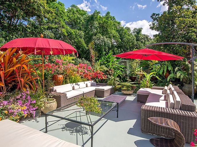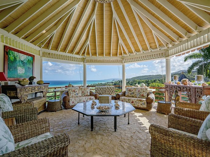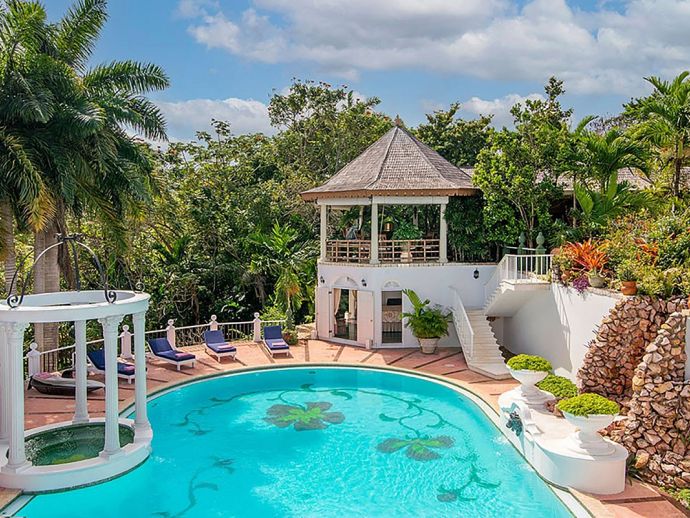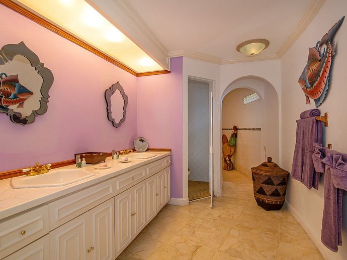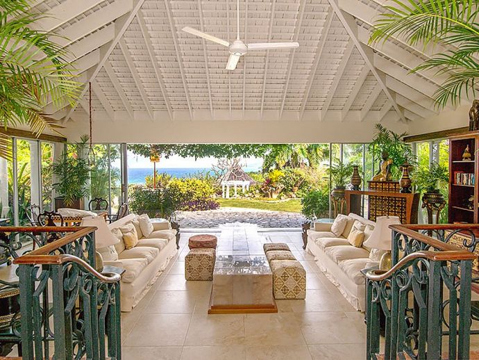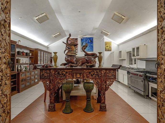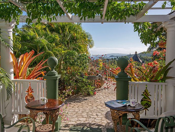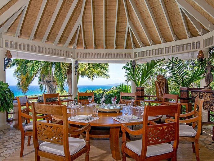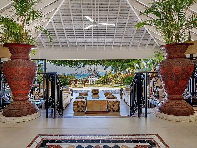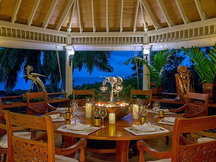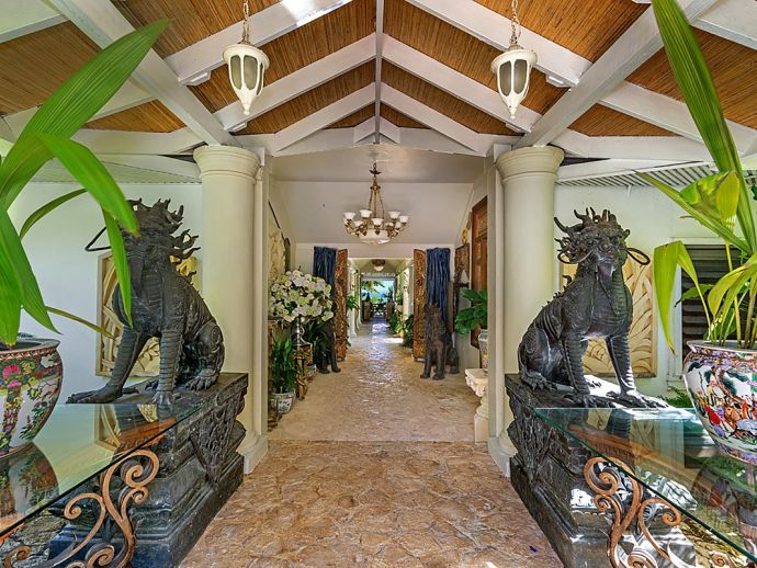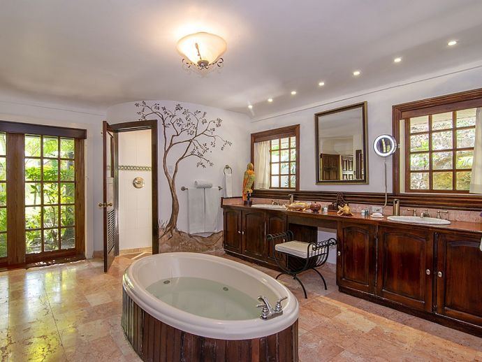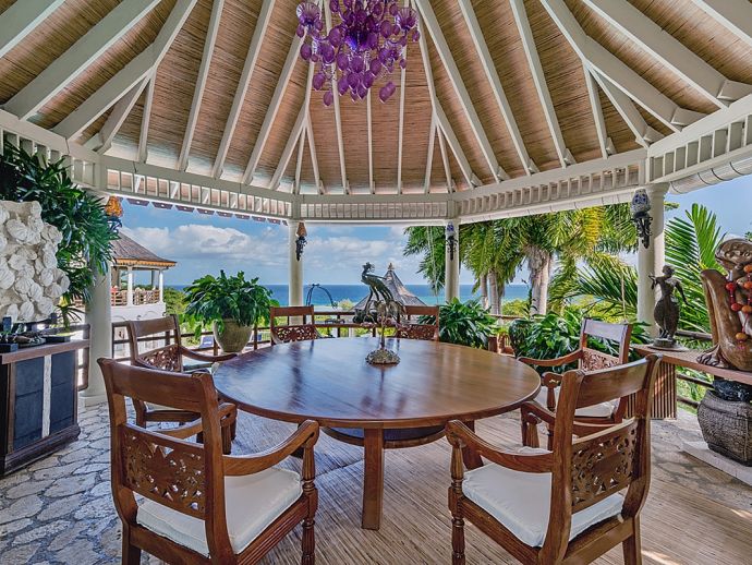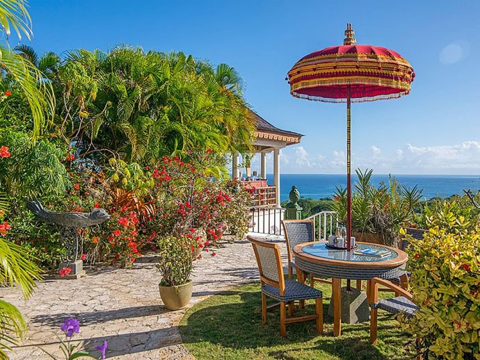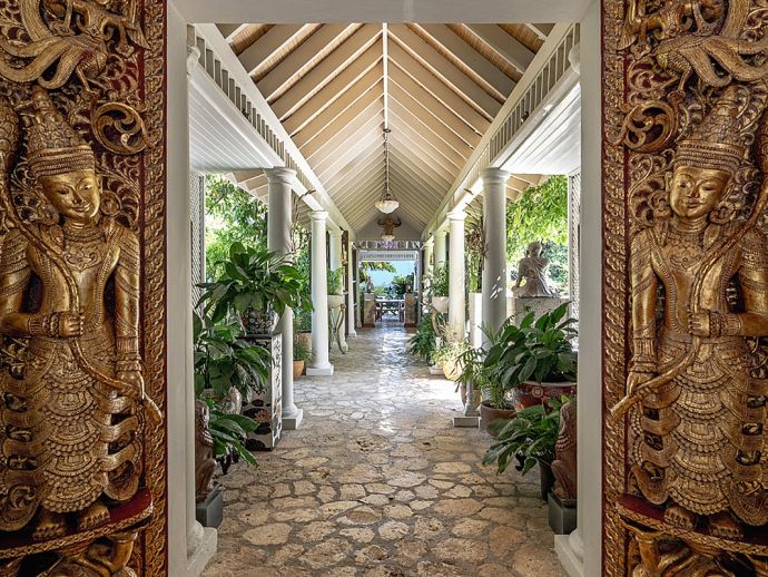 Quiet, serene and set on a hill with far-reaching ocean views surrounded by a truly remarkable garden, Bali Hai is loved by its guests as it allows them to relax, reflect, rejuvenate and recharge. A masterful bringing together of the artistic beauty of Bali with a spirited sense of fun that is uniquely Jamaican. Bali Hai is nothing short of unique. The home has evolved after the owner’s many trips to the East over countless years. Bali Hai represents all that so many seek in Jamaican architecture and it is so designed to allow the cooling breezes to mingle freely. The views are outstanding and particularly at daybreak and at sunset. The bedrooms are all private and well separated from one another. The two Garuda’s that line the entrance driveway are part of Balinese mythological history, as indeed is the beautiful diva. Numerous water features abound and the outside sitting and relaxing area is home to many species of butterfly and dragonfly. Lunch can be enjoyed beside a beautiful pool where Balinese statues of princesses cascade water. A large and comfortable sitting room offers traditional comfort coupled with a splendid view of the Caribbean sea. All five bedrooms extend lovely sea views, exceptional linens, and are extremely comfortable. Ms. Norah, who has been the homeowner’s cook of 20 years, makes delicious homemade croissants as well as local and international specialities. This villa offers you and your family and friends the highest standards possible to eat, sleep, enjoy and have fun as adults as well as children. The linen is of the highest standard, the lacquerware and Burmese silver just add to the restrained but luxurious senses surrounding a beautiful experience. At night the whole property is lit by more than 60 LED lights. A different view of a magical garden. There is a large generator for any eventuality and there are 2 independent Wi-Fi systems ensuring connectivity. SONOS sing alongs as requested. The owner may be in residence.