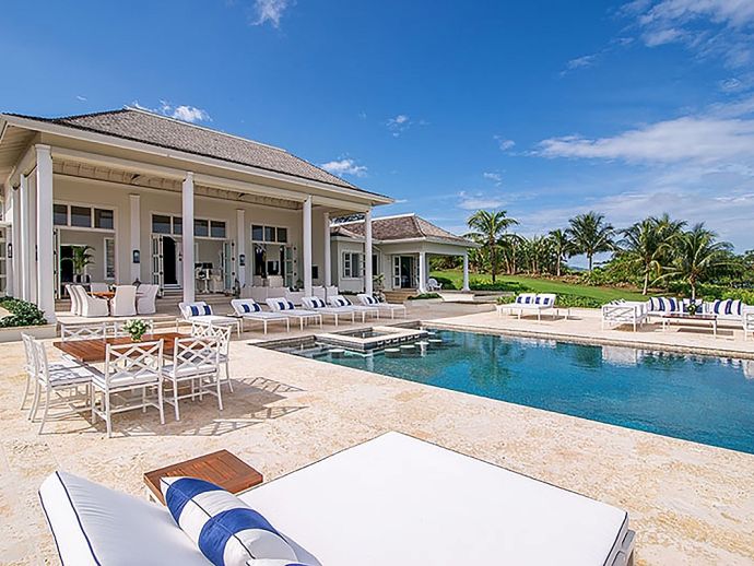 • Classical white garden, immaculately maintained • Heated salt water infinity edge swimming pool • Hot tub • Bar • Fire pit • Putting green •