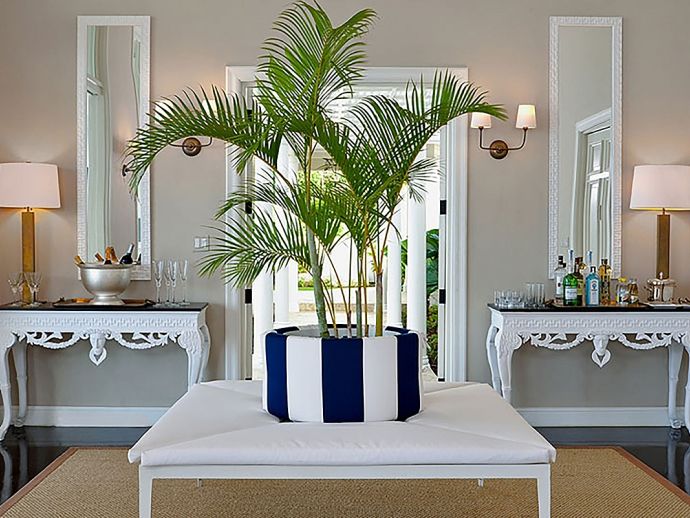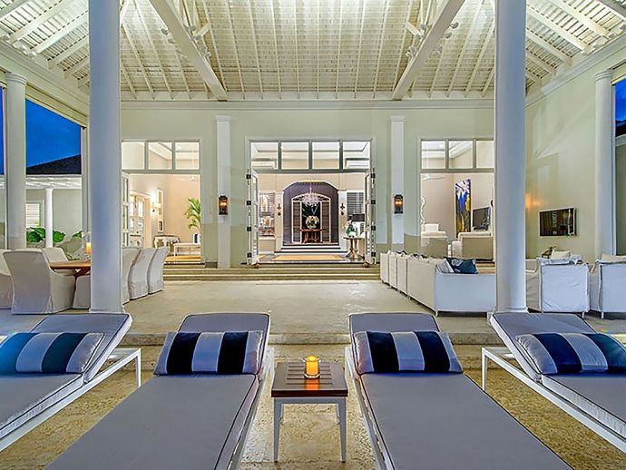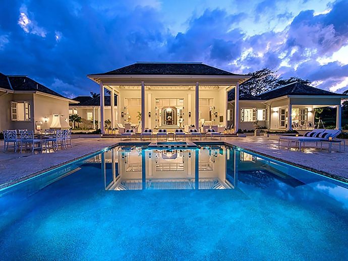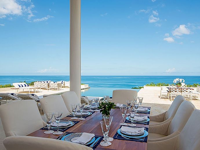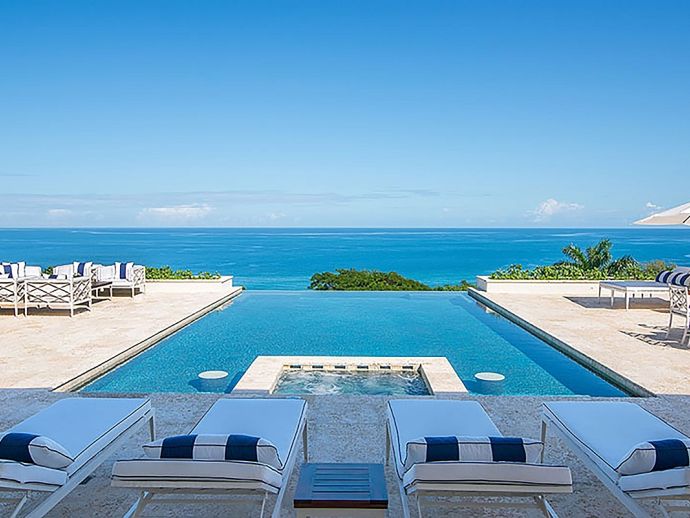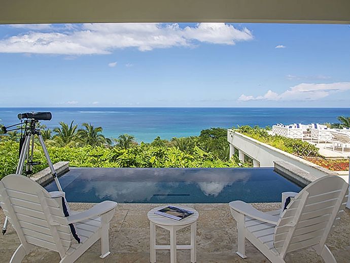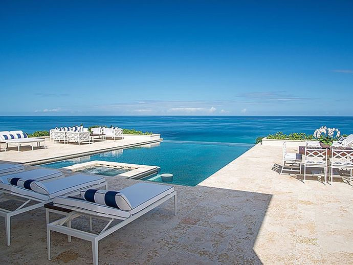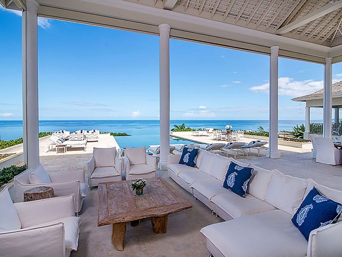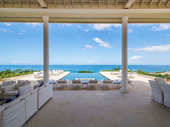 Offering what is undoubtedly the most magnificent ocean views from its commanding position atop Garden Hill; Quinntessential is one of the finest private homes in Jamaica where meticulous attention to detail and designers flourish result in the epitome of sophisticated living without compromise. The handsome white façade with its light-reflecting glass is a magical combination of contemporary design and the principles of 18th century Georgian symmetrical alignment. It is rare for an architect to accomplish this with such aplomb and the effect is breath taking. The imposing front door with its graceful fanlight opens into a perfectly square panelled entrance hall, looking down through the reception room and to the veranda beyond.. The magnificent infinity edge pool is in direct alignment with the front door and the elevation gives the impression that the ocean is flowing into the pool. Inside or outside, elegant living spaces furnished in crisp white with accents of blues in still relaxation; dine outside on the covered veranda or inside at the elegant round Georgian dining table. But of course the pool terrace is the magnetic draw with the heated salt water infinity pool and integrated hot tub. As the evening air cools, enjoy drinks from the bar at the fire pit or adjourn to the pub below the pool with its adjacent putting green. Accommodating 10 guests in five bedrooms, the magnificent master suite in the main house comprises a private sitting room, bedroom and terrace with infinity-edge plunge pool. In the adjacent cottage which is just four or five steps from the house are three bedrooms, two on the upper level and one downstairs with an adjacent sitting room or snug. The fifth bedroom is privately located adjacent to the the pool. All bedrooms face the fabulous ocean panorama; four have king beds and one twin beds which combine to form a king. The exquisite bathrooms are fitted by Waterworks throughout; two have a tub as well as walk-in shower and the remaining three have showers. Anticipate individuality in each bedroom with bespoke furniture custom made for each room. Outside, a classical white garden surrounds the villa, immaculately maintained and affording wonderful privacy.