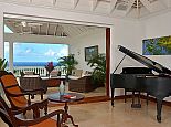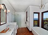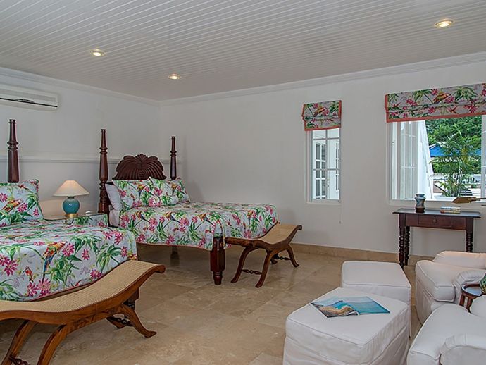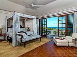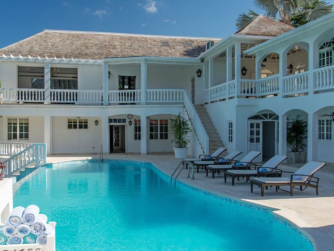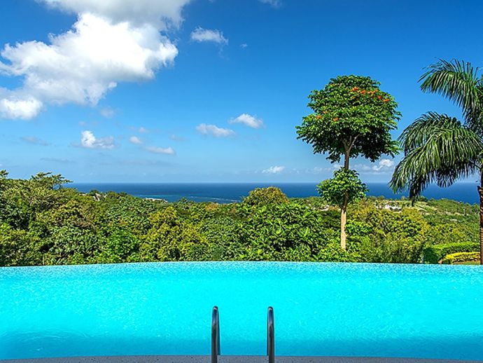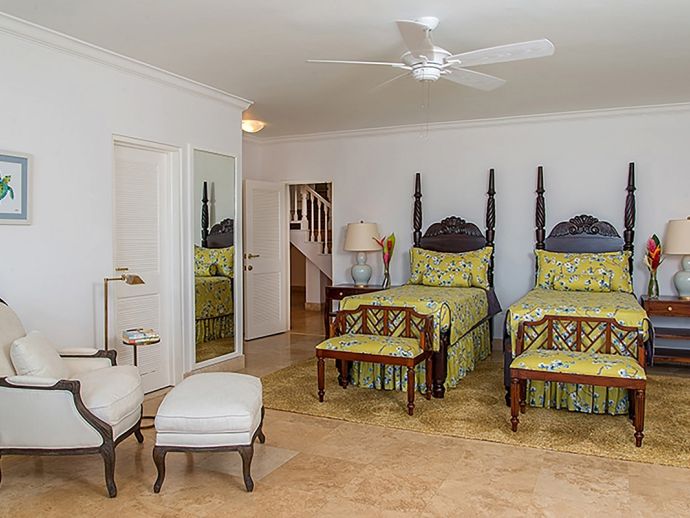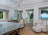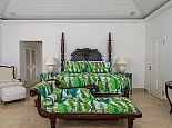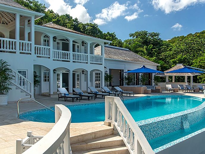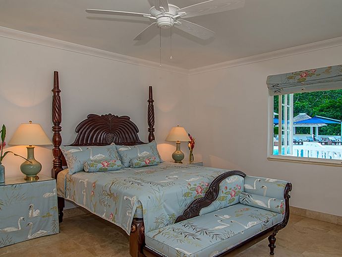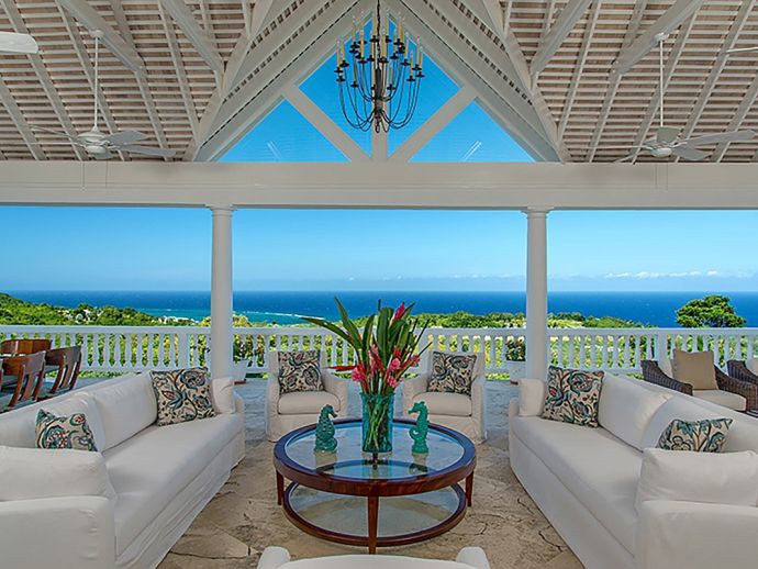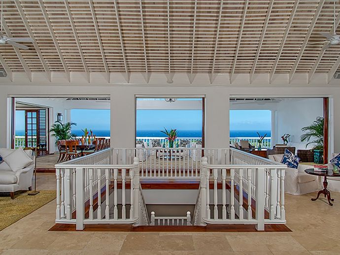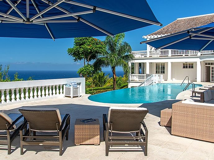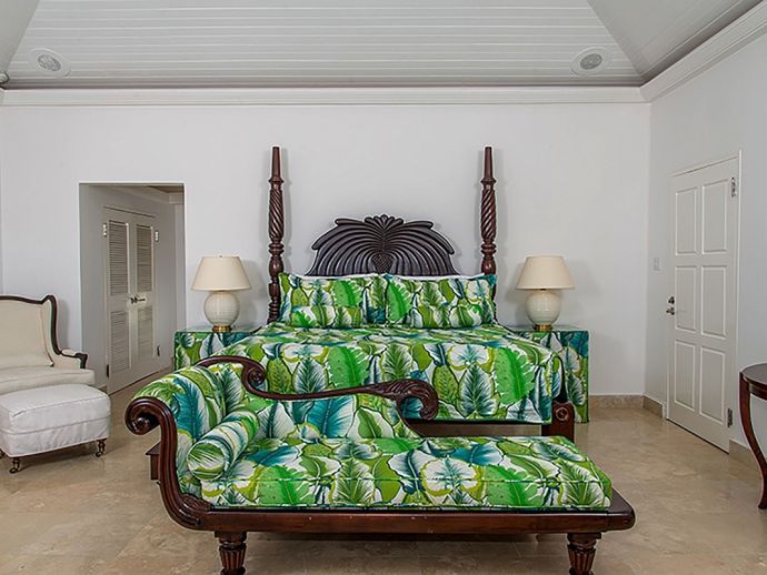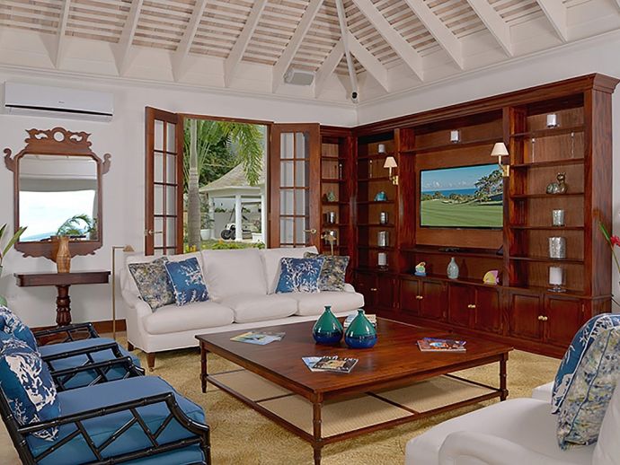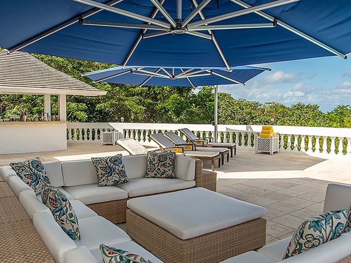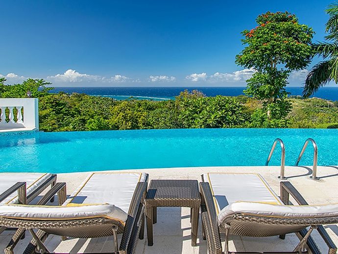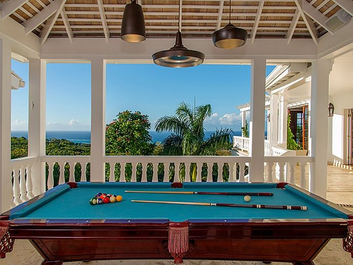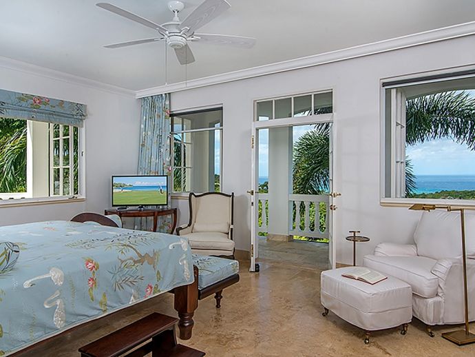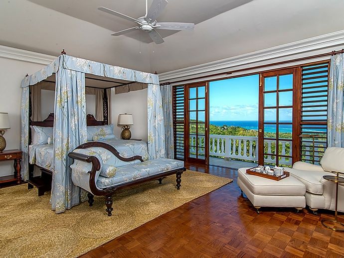 With an ocean panorama that is nothing short of awe-inspiring, this grand ten-bedroom villa with large airy rooms exuding sophisticated style, a terrific infinity pool, a cascading garden waterfall, children’s playground and the choice of outdoor or indoor air-conditioned living make this a one-of-a-kind villa. Occupying a commanding elevated location, Villa Amana offers magnificent ocean views and a backdrop of deeply forested hills and is just a short journey in one of the complimentary golf carts to all the amenities, legendary golf course and beach. Built in a striking colonial style with white-rendered walls, the villa is on two levels offering large rooms and a backdrop of tropical hillside forest. To the front, the commanding ocean view is truly spectacular and because of the elevation, at certain times of the day the curvature of the earth can be seen. The large circular courtyard entrance to the villa is backed by a spectacular hillside garden with a lovely water feature that cascades down. The bedrooms are very spacious offering air conditioning as well as ceiling fans. Most are designed to maximize the spectacular views with huge windows and private balconies. En-suite marble bathrooms with travertine floors accompany each bedroom with the master bathroom being clad in a beautiful white marble. All of the bedrooms are furnished with beautiful Jamaican mahogany four-poster beds. There are eight bedrooms in the core of the villa; two upstairs including the master and six downstairs. A further two bedrooms, both with king beds are in the west wing; one upstairs and one downstairs. Throughout, the white walls are accented with beautiful fabrics from Nina Campbell, Schumacher and Brunschwig and Fils. The main balcony of the villa easily accommodates 50 people for a cocktail party and is the natural lounging, entertaining and dining spot. A combination of modern rattan furniture and white upholstered sofas and armchairs invites relaxation and the mahogany dining table can seat 20 guests. The formal, air-conditioned dining room can seat 20 guests at the bench made mahogany table with elegant pineapple-back dining chairs. There are spectacular views out to sea as well as across the swimming pool and to the hills beyond. The large and exceptionally high-ceiling sitting room has three wide and tall openings onto the veranda bringing the stunning view of the ocean inside. These openings can be closed allowing the room to be air-conditioned if so wished. Comfort prevails with conversational groupings of large sofas and armchairs. There is also a grand piano which adds panache to cocktail hour. On the lower floor of the villa is a business office which is well-equipped with a computer, fax machine and printer. Outside is a superb infinity pool with poolside bar overlooking the sea with deep rattan pool chairs and plenty of umbrellas. A dedicated children’s playground with swings, a slide as well as a basketball court is always a hit with youngsters as is the pool table located on an upper veranda. Opposite the playground is a very well equipped private gym.