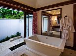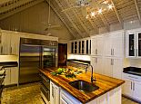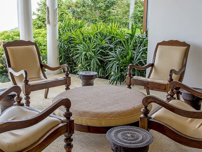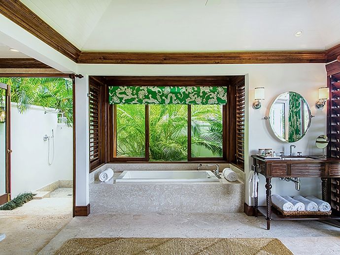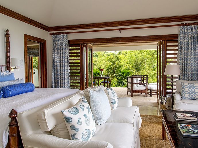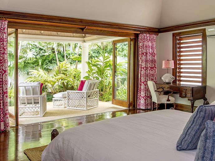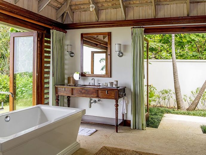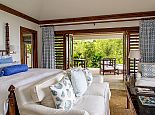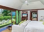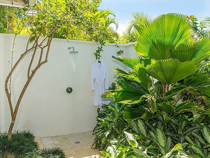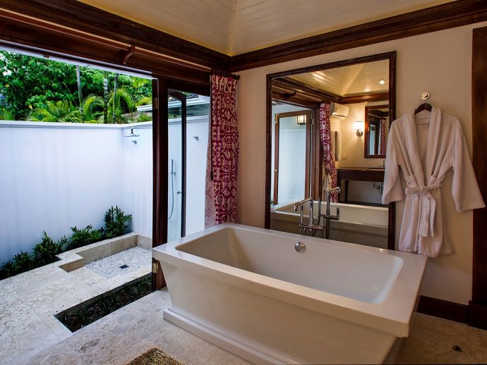 There are three bedrooms in the main house and two bedrooms in each of the two guest cottages. The two master suites both have king size beds; one has a private plunge pool and the other a magnificent soaking tub with unobstructed ocean views. Each guest bedroom has its own private en-suite bathroom and four en-suites open to outdoor showers offering an invigorating natural experience. Four of the bedrooms can be configured as kings or twin beds, depending on guest needs.