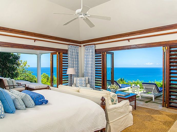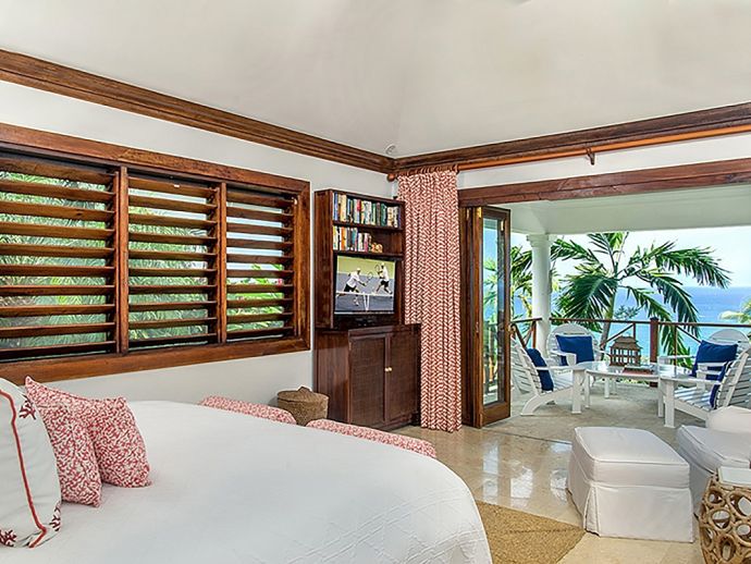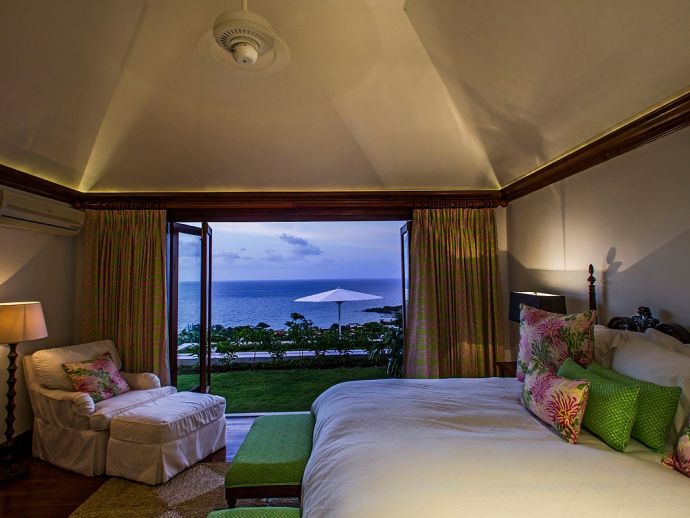 Master Suite 1: king-size bed, en-suite bathroom (walk-in shower, outdoor shower, separate bathtub) Doors to lawn area/sea views