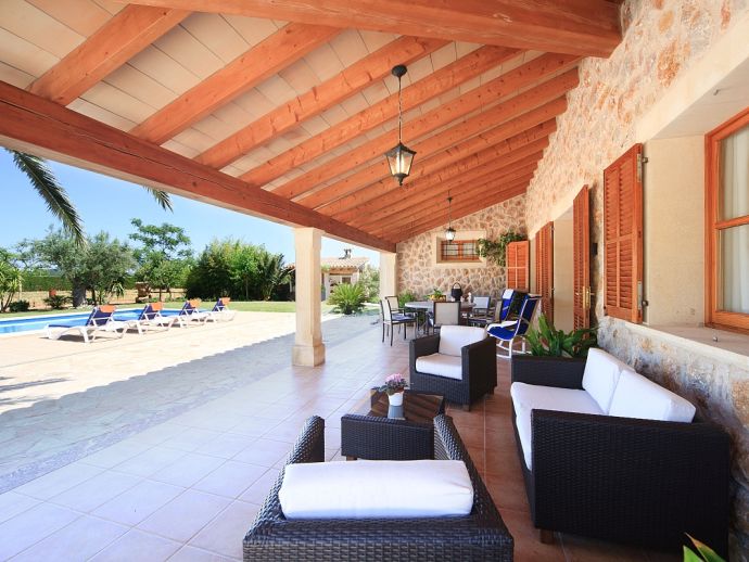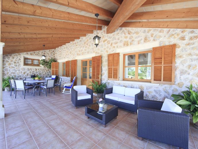 Covered terrace with lounge and dining furniture.