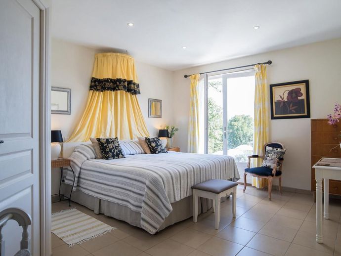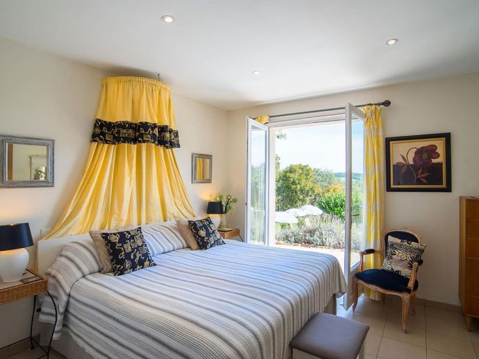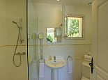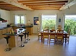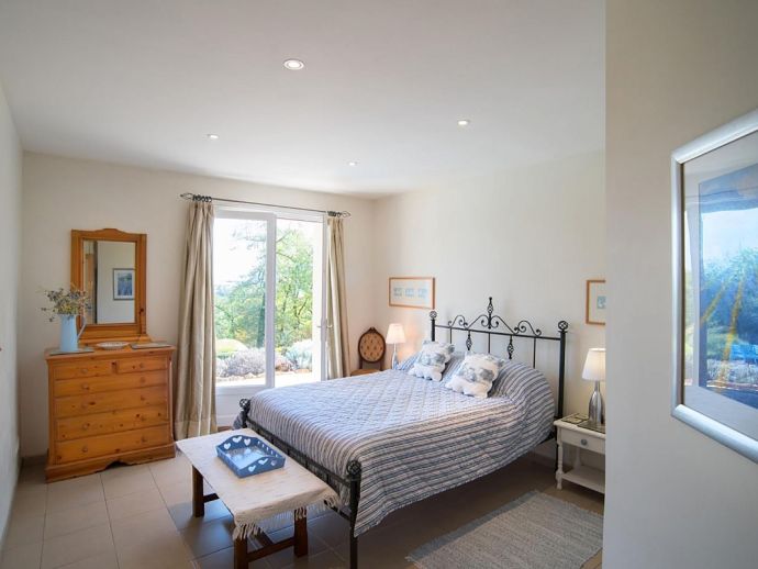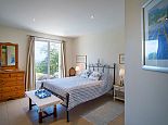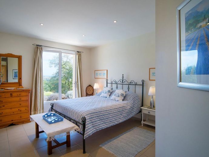 Oak stairs lead down to the other bedrooms, two of which have access to the garden. In keeping with the rest of the house, they are stylishly decorated, each with their own colour theme. Finally, mention must be made of the mezzanine, a bedroom/living space ideal for teenagers or young adults, with its fantastic views towards mountains in the far distance.