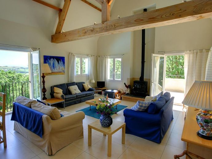 On the main floor, a double height ceiling makes a striking impression and creates an airy, spacious feel. Within the open plan layout, there are three distinct zones: to one end sits the modern sleek kitchen providing everything (and more!) for a self catering holiday, the dining area enjoys views over the pool and at the far end plump sofas are grouped around the wood burning stove. A double bedroom and shower room complete this floor.