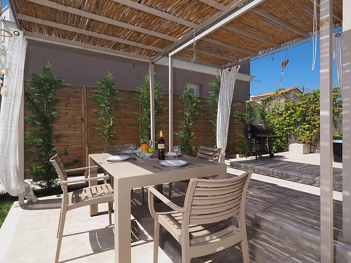 Outside: Sun terrace. Shower. Barbecue. Private parking.