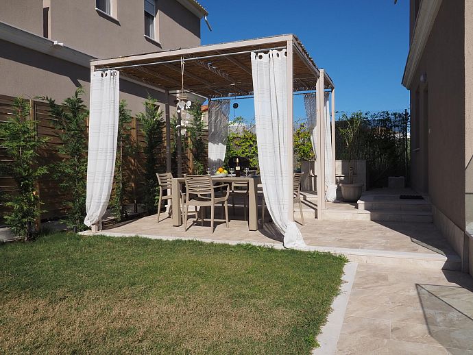 Tucked away at the end of a short unmade track Klio with its two sister properties Erato and Thalia are within easy walking distance of restaurants, amenities and the wonderful family-friendly beach of Saint George. Minimarkets, coffee shops, bars and tavernas (the nearest only 70m away) line the coastal lane that runs through the centre of town and are all just a short stroll away. The magnificent sandy beach of Saint George Argyrades is just 110 m and stretches for over 9 km bordering with the equally lovely beaches of Issos to the north and Marathia to the south.