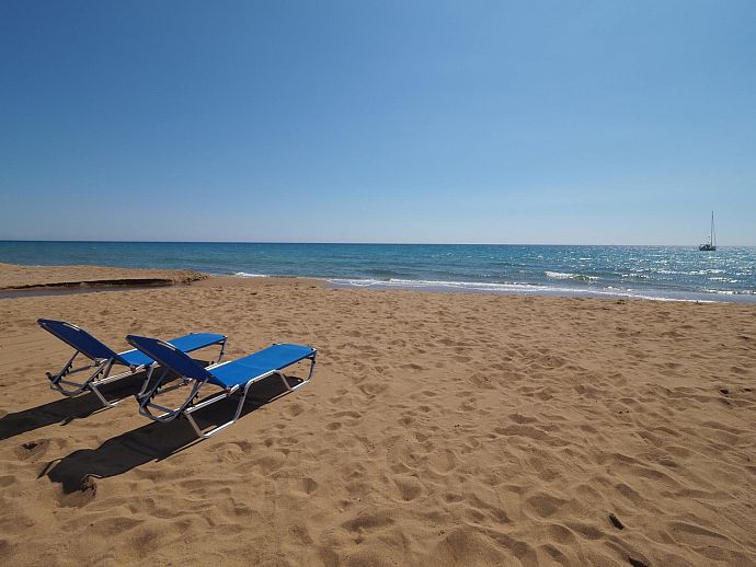Just 100m away, the magnificent sandy beach of Saint George Argyrades stretches for over 9km bordering with the equally lovely beaches of Issos to the north and Marathia to the south. Bisected by a small harbour in the middle, the predominantly sandy shoreline shelves gently into clear, translucent waters. Various water sports including boat hire, jet skis and scuba diving are regularly available over the main season and there are sunbeds and umbrellas for rental on the well-tended beach.