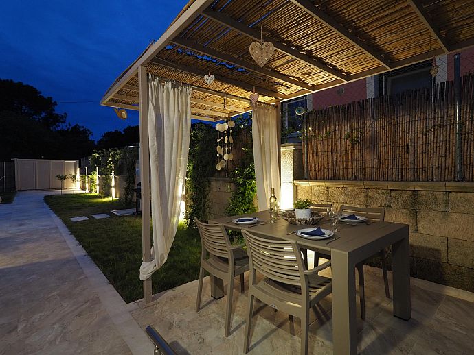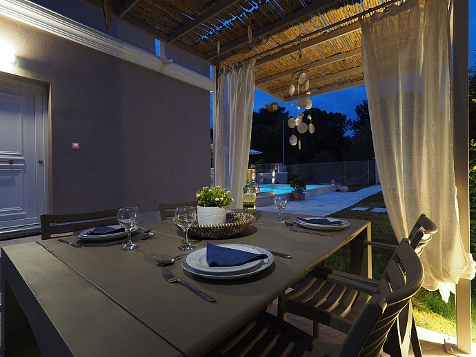 Tucked away at the end of a short unmade track Erato with its two sister properties Klio and Thalia are within easy walking distance of restaurants, amenities and the wonderful family-friendly beach of Saint George. Minimarkets, coffee shops, bars and tavernas (the nearest only 60m away) line the coastal lane that runs through the centre of town and are all just a short stroll away. The magnificent sandy beach of Saint George Argyrades is just 100 m and stretches for over 9 km bordering with the equally lovely beaches of Issos to the north and Marathia to the south.
