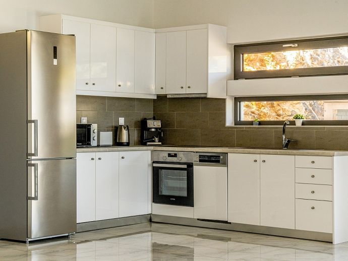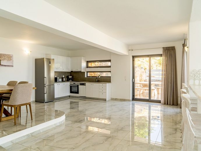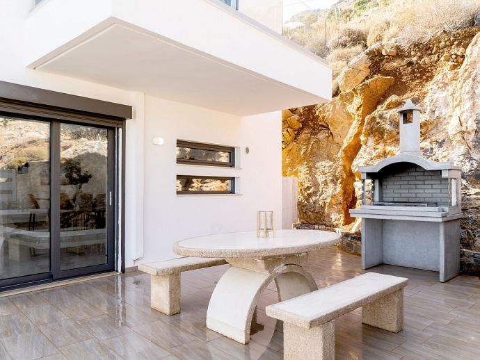 Thalassa Bliss with a private pool offers stunning sea and mountain views and is located a few minutes drive from Elounda, an area renown for it's beauty. The villa sleeps 6 guests in modern, stylish and fully air-conditioned interiors. The ground floor comprises, a spacious living area with a fully equipped kitchen, dining table/chairs and lounge with large windows and patio doors out to the garden and pool. A twin bedroom with en-suite bathroom and a separate cloakroom. Upstairs there are 2 further double bedrooms each with en-suite bathrooms, they also have balconies with far-reaching sea views. For safety reasons the first floor terrace area to the front is not available for guests to use. Outside, the villa is surrounded by beautiful gardens with a private pool, sunbeds, outdoor furniture and built-in barbecue area, perfect for meals al fresco. Thalassa Bliss is a great choice for those seeking comfort and beauty. It is ideal for families or groups and promises a memorable stay with its luxurious amenities and stunning views.