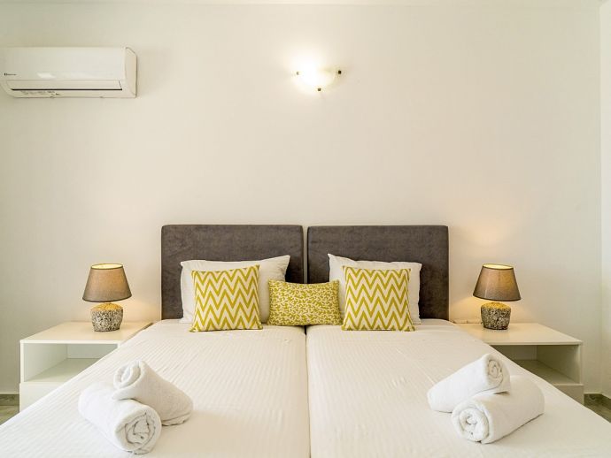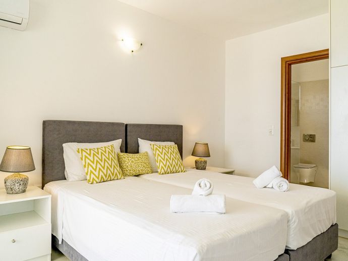 Bedroom: 2 single beds, A/C, en-suite bathroom, doors to terrace