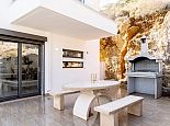 Sun loungers, outdoor furniture, dining terrace, built-in barbecue.