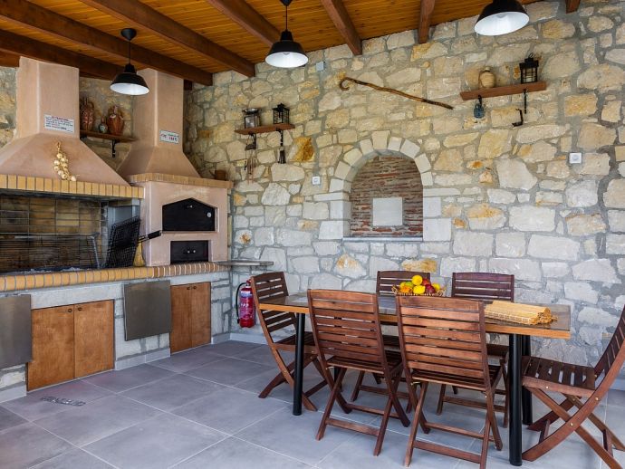 Covered barbecue area, built-in barbecue, wood oven, sink, dining furniture.