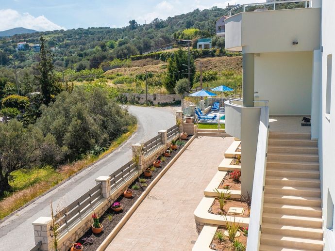 Located in the area of Giannoudi in Rethymno in a quiet and idyllic setting with a beautiful natural landscape and a view of the sea in the background. It is just 3 km from the beach and 6 km from the centre of city, so an ideal location to explore the many Crete attractions, nearby are the Monastery of Arkadi at the foothills of Psiloritis, (Mount Ida) and the historic town of Rethymno with its marina, quaint old town and Venetian Fort. You can climb aboard the Happy Train and take a trip to the waterfalls of Argyroupoli which is the perfect way to cool down after hot days on the beach.