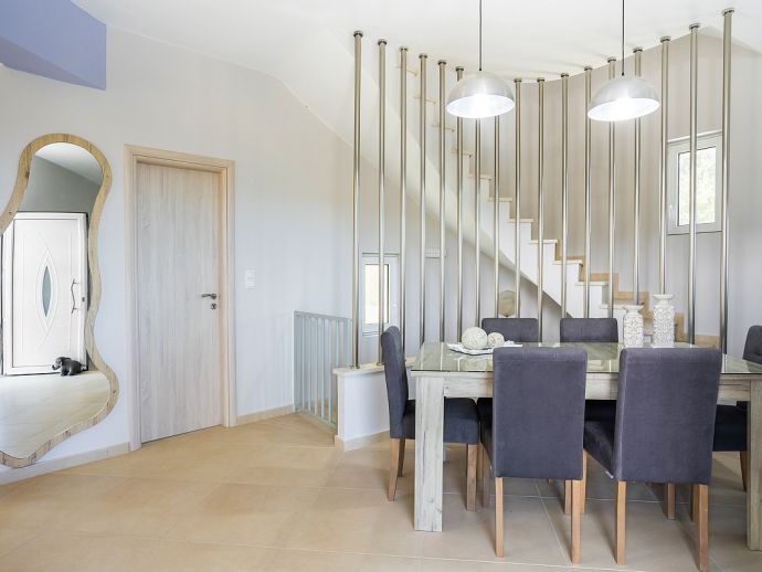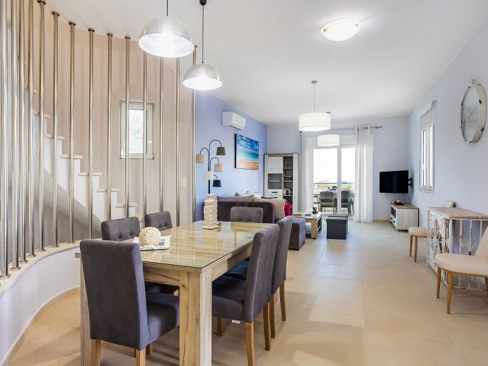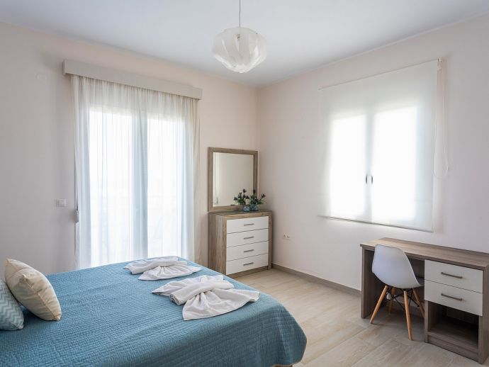 Villa Eos has an idyllic setting in the Giannoudi area of Rethymno, offering a natural landscape, views to the sea and a convenient location close to beaches and to the centre of Rethymno. The villa is distributed over 2 floors, fully air-conditioned with Wi-Fi throughout and sleeps 6 guests in comfortable and modern interiors. It comprises 3 bedrooms with balconies, 3 bathrooms, a fully equipped kitchen and an open plan dining and living area with patio doors to an outside dining terrace. Set in enclosed grounds with parking, the villa also offers a private swimming pool, sun loungers and a covered dining area with built-in barbecue and wood oven. From the various balconies you can enjoy the views and relax and unwind. Villa Eos is a perfect choice for families or friends seeking a peaceful retreat and a memorable holiday in Crete!