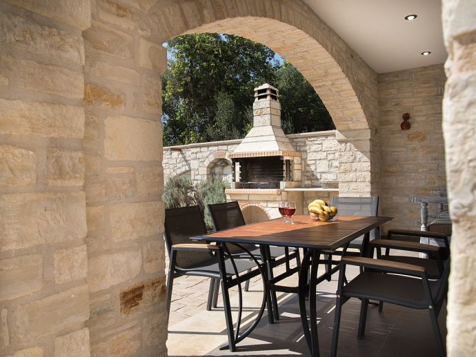 Sun terrace with loungers, outdoor furniture, dining area and built-in barbecue.