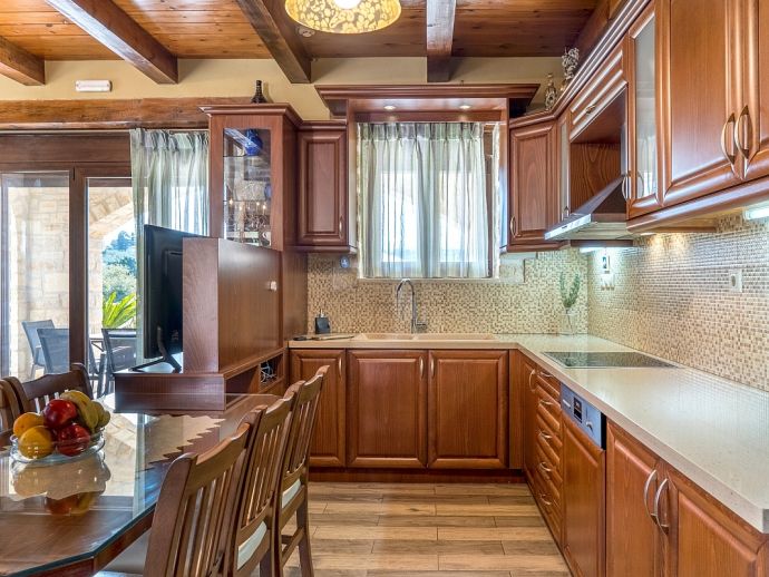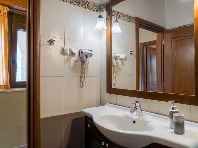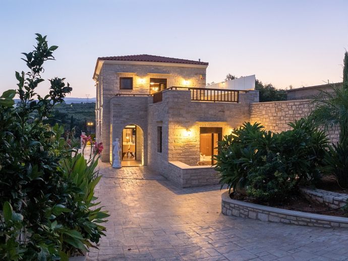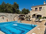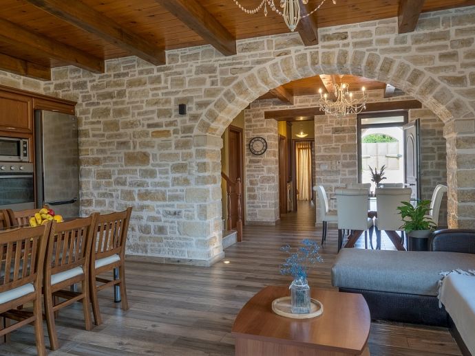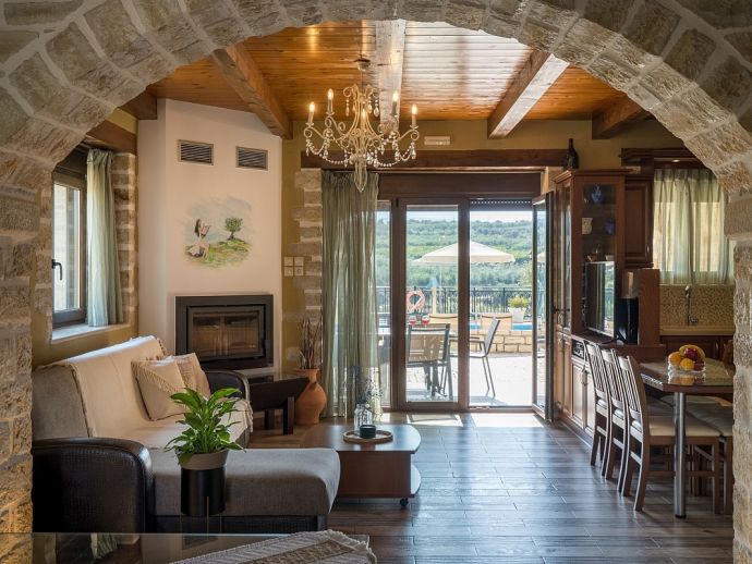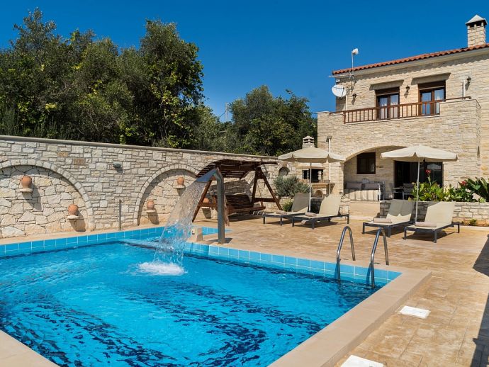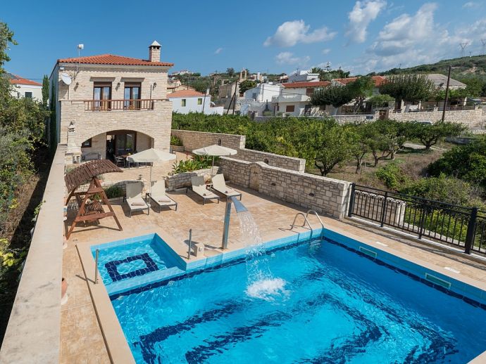 Calliope´s Oasis with a private pool is set in the beautiful village of Asteri, surrounded by olive groves and is just 10 minutes drive from the beaches on the north coast. The villa has been constructed from organic materials such as wood and stone and sleeps 6 guests in interiors mixed with modern amenities and traditional Cretan charm. Air-conditioning and Wi-Fi is provided and both are included in the rental price. There are 3 bedrooms, 2 doubles on the first floor that share a full bathroom and have access to a terrace with far-reaching views over the countryside, a further twin bedroom and shower room is on the ground floor. The living area includes a flat-screen Smart TV with satellite channels, a dining table/chairs and a hand-crafted kitchen which is fully equipped with all appliances and utensils needed for a self catering holiday. One of the many highlights to this property is its' private swimming pool, it includes a water feature and a separated section designed for children, ensuring a safe and enjoyable experience for families. Surrounding the villa is a lush garden which adds to the tranquil ambiance. For those who love outdoor dining, there is a built-in barbecue for preparing delicious meals in the open air. Calliope's Oasis is a perfect choice for families or friends seeking a peaceful retreat in a characterful villa and a memorable holiday in Crete!