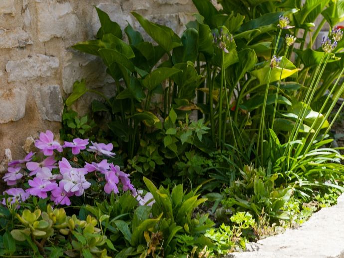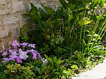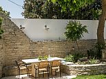 Enclosed pretty garden with a lawn, fruit trees and shrubs.