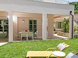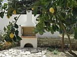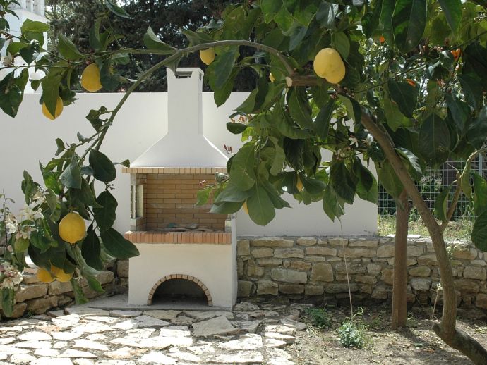 Sun loungers and umbrellas, outdoor furniture, brick-built barbecue.