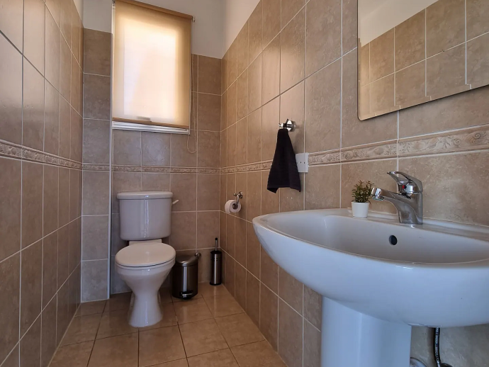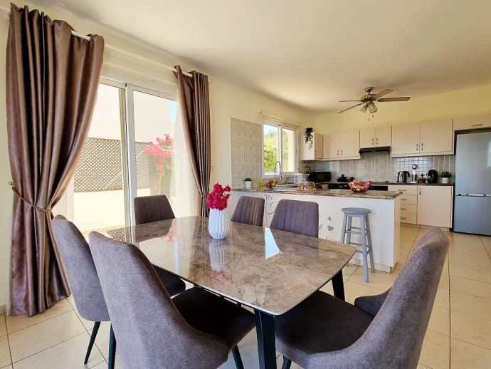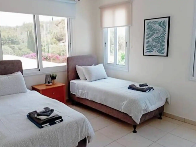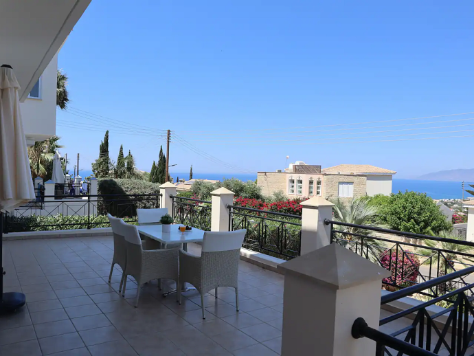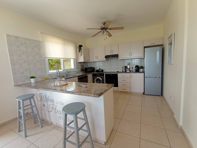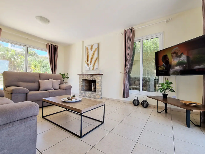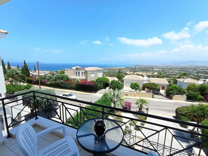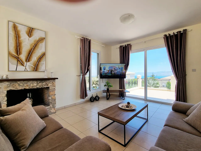 Villa Ismene with a private pool is situated on top of the hill in Neo Chorio village and offers amazing panoramic views to Polis Chrysochous bay. This modern villa sleeps 6 guests and has 3 bedrooms (air conditioned as an optional extra), spacious and beautifully decorated living areas and is equipped with all the necessary amenities for a relaxing family holiday. On the ground floor there is a large living room with a fireplace and big glass doors with views to the pool, garden and sea. There is also a dining area with comfortable seating for 6 guests, a fully equipped modern kitchen and a cloakroom (w/c). A staircase leads to the first floor where you`ll find 3 spacious bedrooms, two with a double bed and one with two single beds as well as two bathrooms, one of them is en-suite. There is a nice small balcony with a sitting area form where you can enjoy uninterrupted sea views. The villa is is built on a big plot of land and has a private pool, furnished terraces and a garden with plenty of trees and plants. Villa Ismene is conveniently located 400 meters from a local taverna and and 5 minutes drive from the coast with beautiful beaches easily reached in both directions.